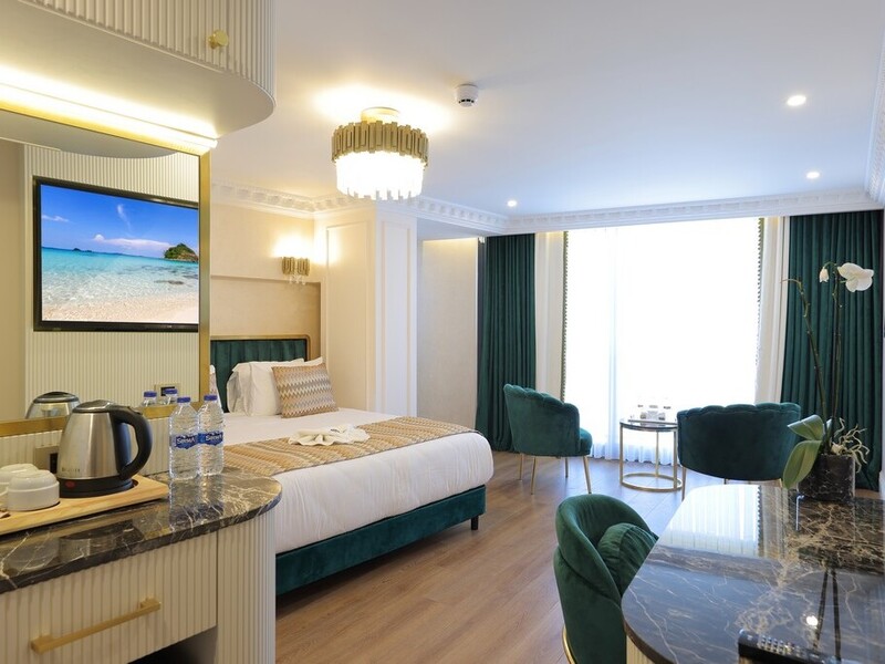 キングサイズベッド1台のお部屋です。イスタンブールの活気あふれる街中で静かなひとときをお過ごしいただけるよう、細部にまでこだわって設計されています。160×190cmのダブルベッドを備え、観光で疲れた一日の疲れを癒すのにありがたい広さです。また、こちらのお部屋では防音対策もなされています。お部屋全体に防音対策が施され、静寂のひとときを提供してくれます。