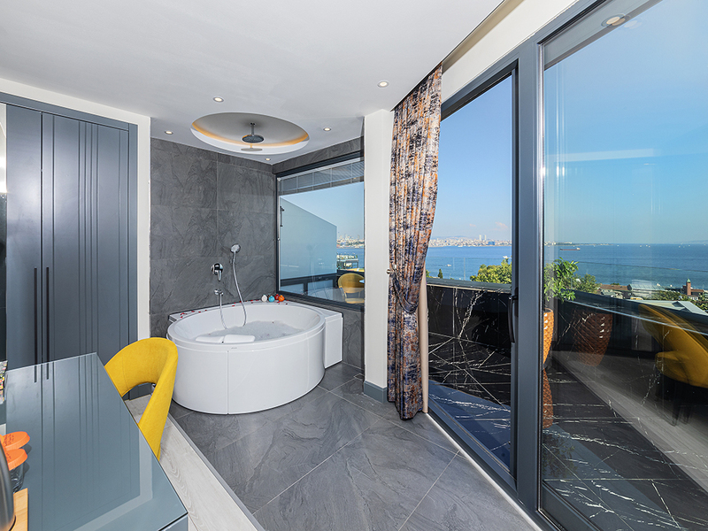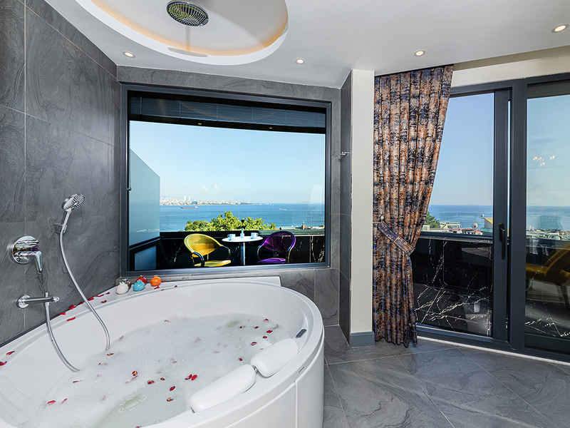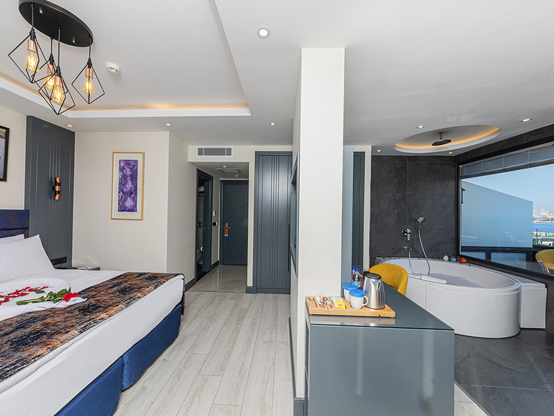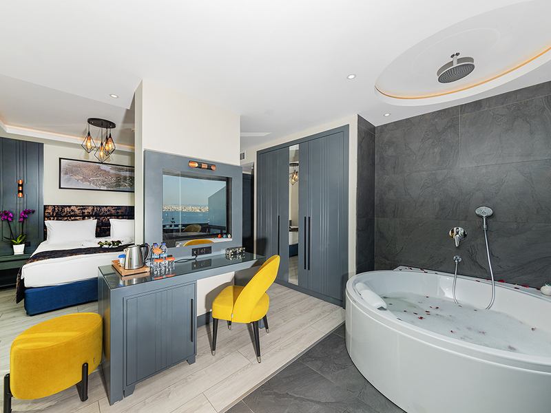 キングベッド 1 台のお部屋です。マルマラ海を見渡すことができ、15mにも及ぶ広さを誇るバルコニーと、大きなガラス窓からその眺望を楽しめるジャグジーが付いております。このホテルで最も贅沢な滞在を体験してみませんか?