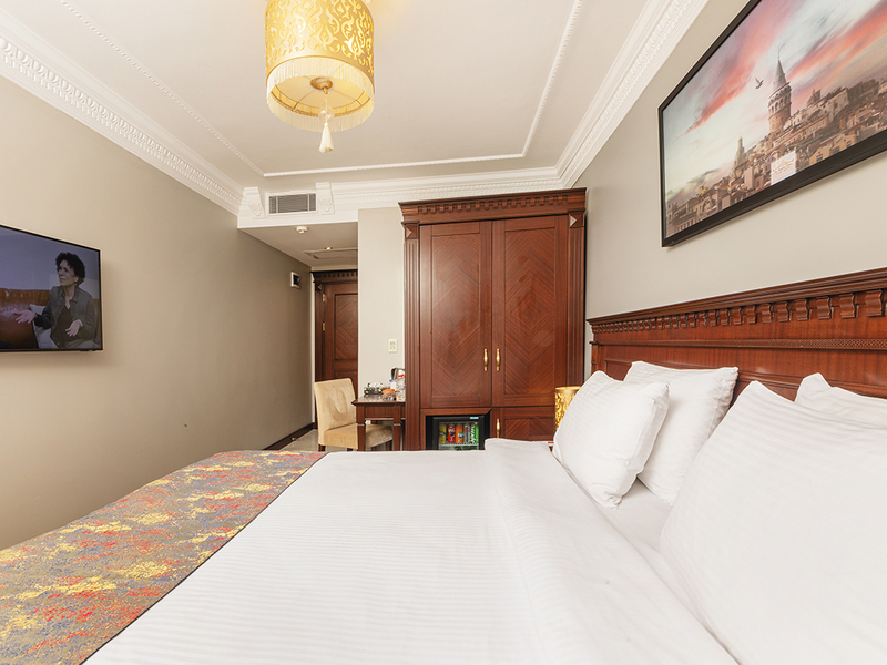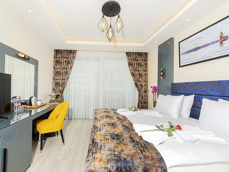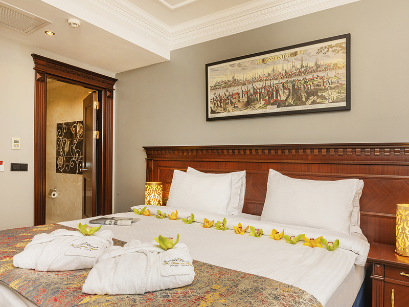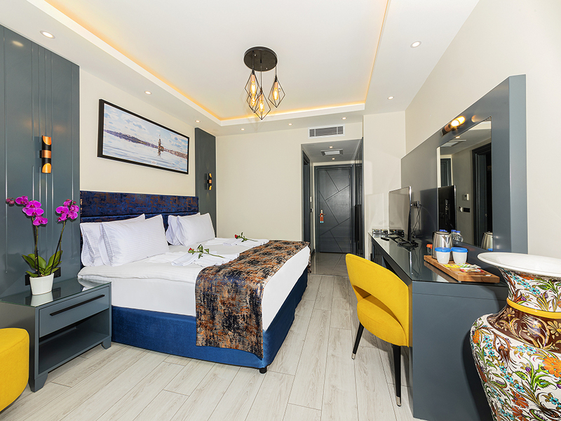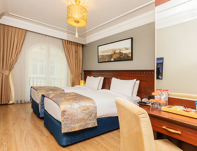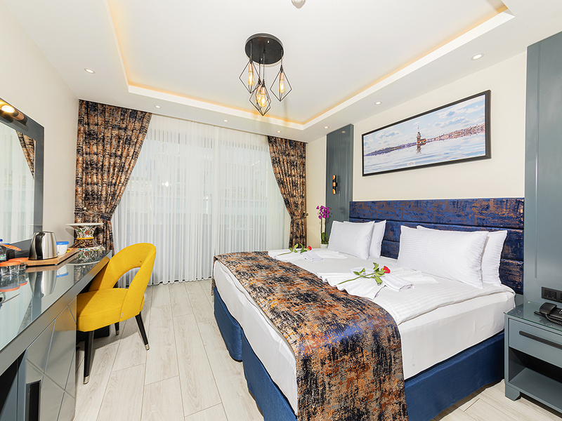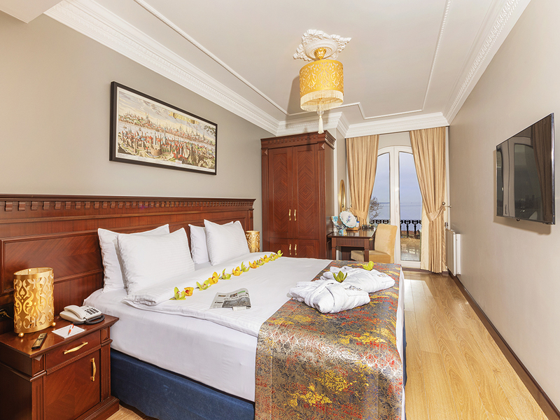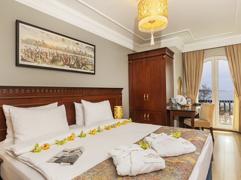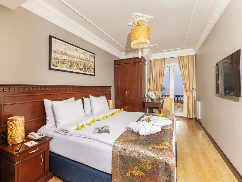 ダブルベッド 1 台またはシングルベッド 2 台のお部屋です。マルマラ海の眺めが広がるデラックスルームは、専用バルコニーから差し込む自然光に包まれています。デスクには調度品が置かれ、異国情緒を一層高めてくれます。