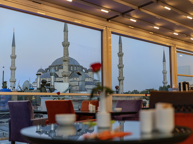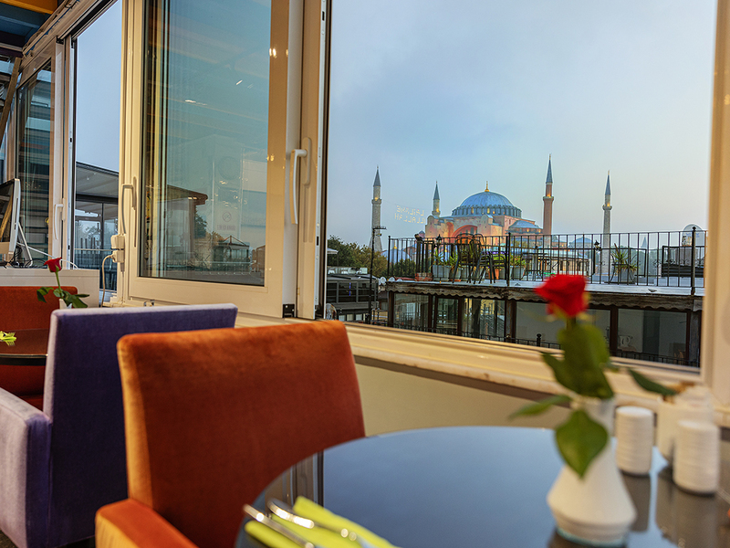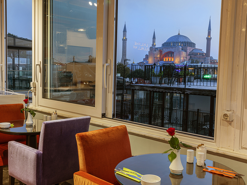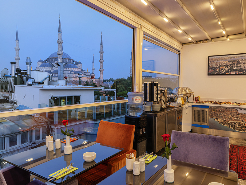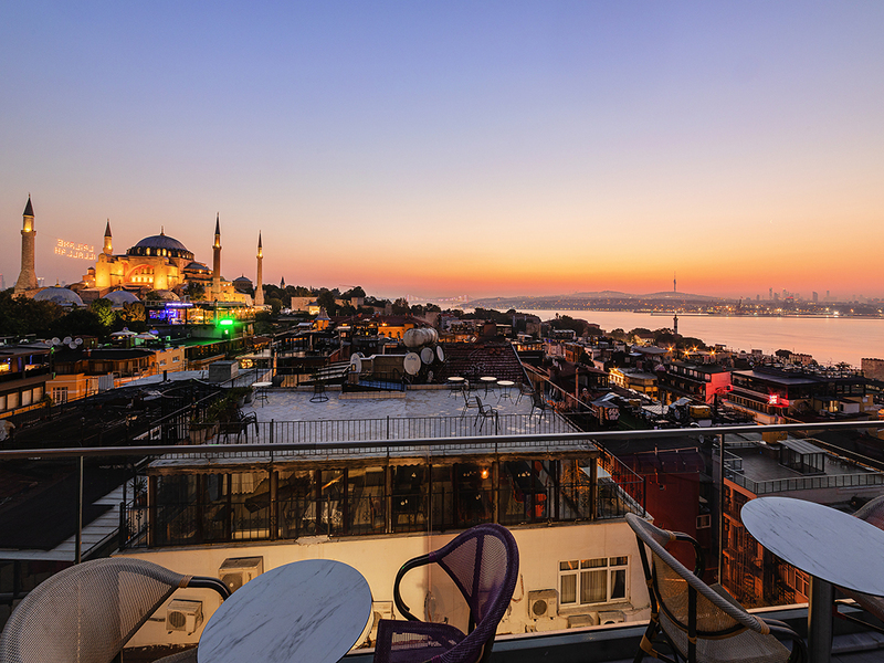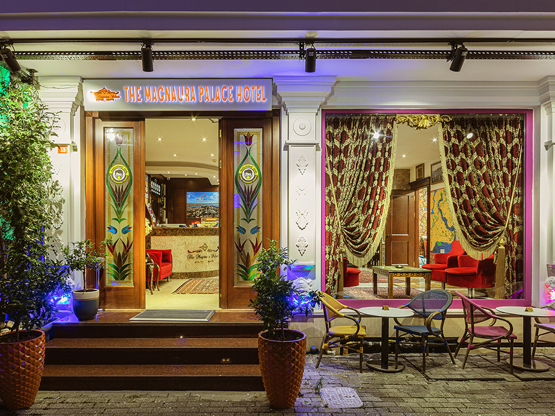 夕刻にテラスに上がれば、モスクの輝きと町のきらめき、そして夕焼けが織りなす宝石箱のような光景が、皆様を包み込みます。ザ マグナウラ パレスはブルーモスクやアヤソフィア、そしてホテルの名前に由来する旧マグナウラ宮殿の遺跡に囲まれた、歴史的スポットにたたずむホテルです。ランク自体はビジネスホテルと同等ですが、それ以上の魅力にあふれています。ブルーモスクとアヤソフィアには両方ともホテルから徒歩5分ほどでアクセス可能。観光にとてもおすすめなホテルです。