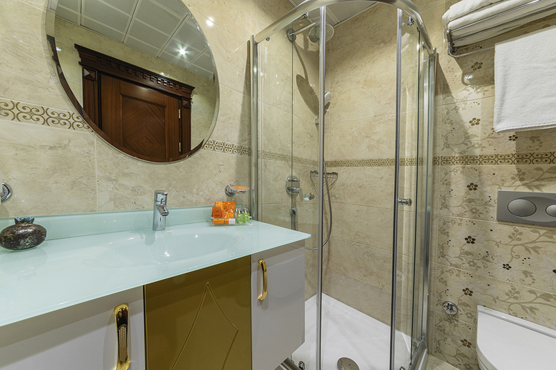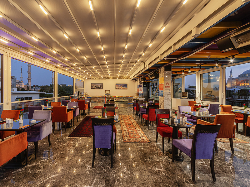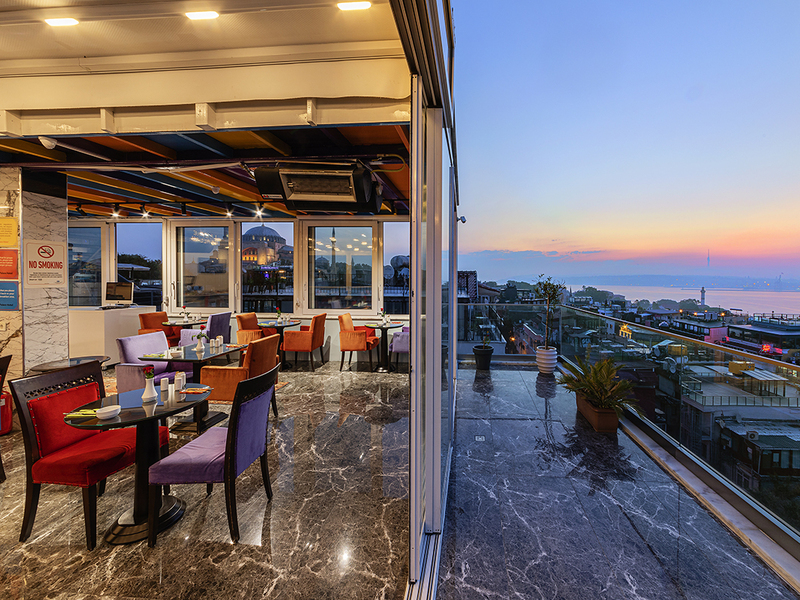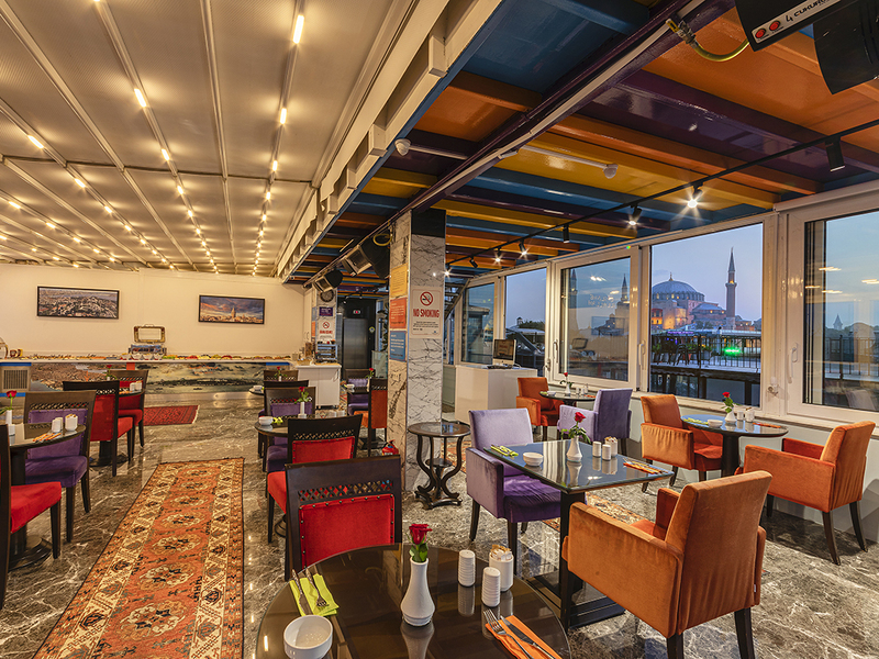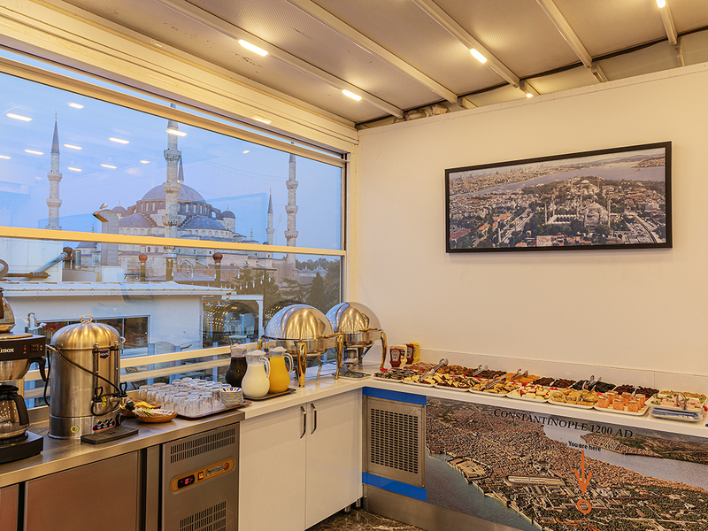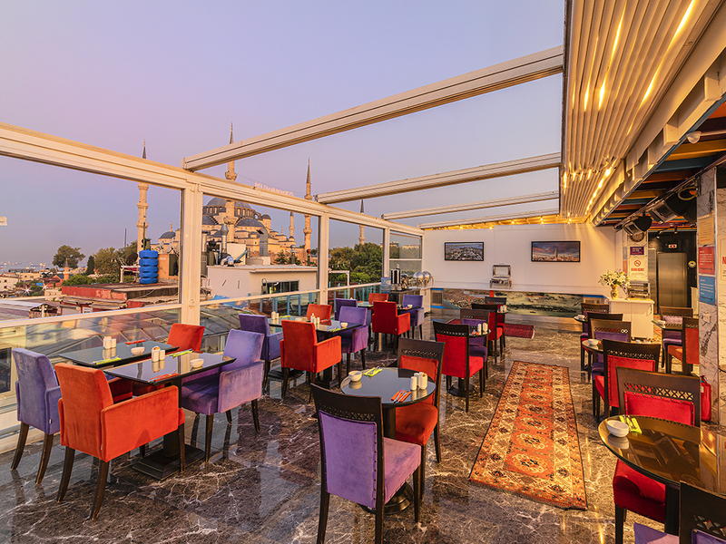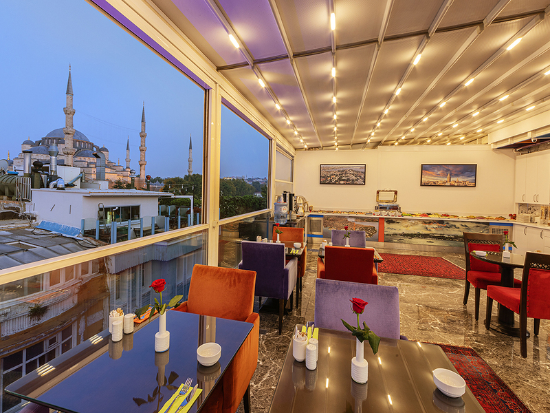夕刻にテラスに上がれば、モスクの輝きと町のきらめき、そして夕焼けが織りなす宝石箱のような光景が、皆様を包み込みます。ザ マグナウラ パレスはブルーモスクやアヤソフィア、そしてホテルの名前に由来する旧マグナウラ宮殿の遺跡に囲まれた、歴史的スポットにたたずむホテルです。ランク自体はビジネスホテルと同等ですが、それ以上の魅力にあふれています。ブルーモスクとアヤソフィアには両方ともホテルから徒歩5分ほどでアクセス可能。観光にとてもおすすめなホテルです。