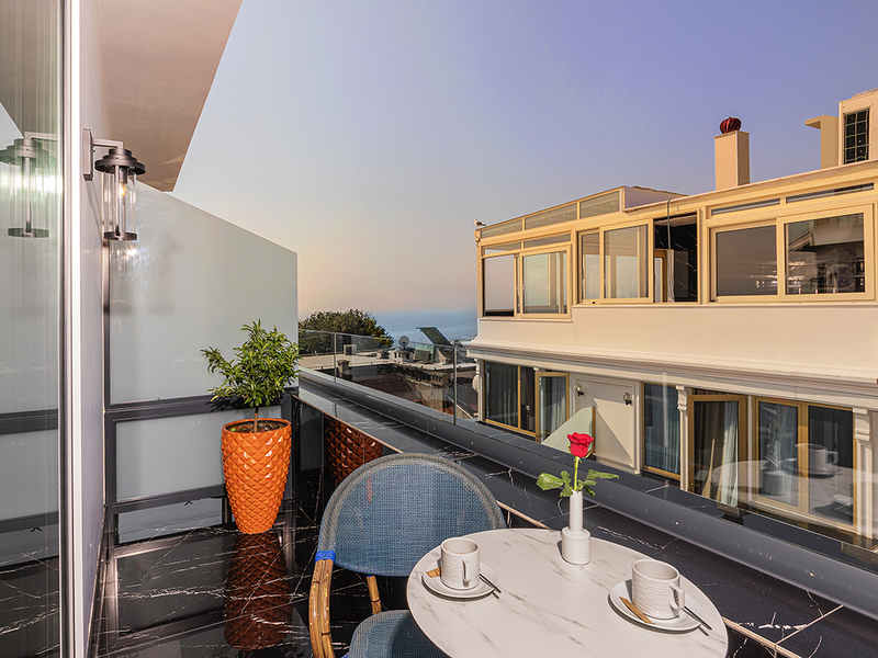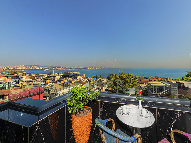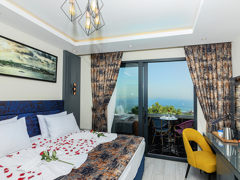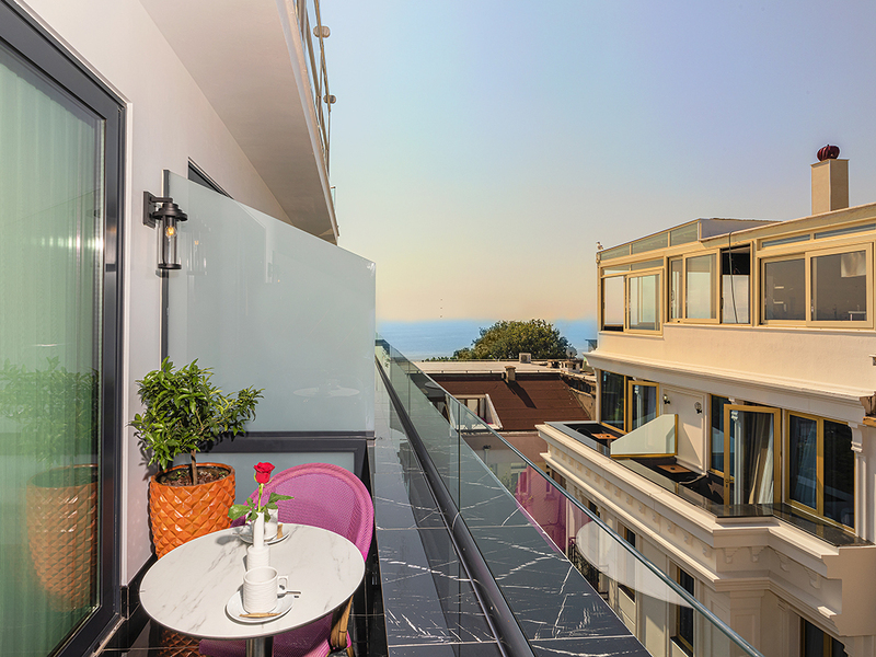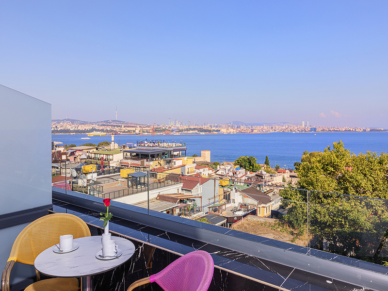 キングベッド 1 台のお部屋です。広々とした専用テラスからは、マルマラ海とアジア側の素晴らしい眺望をお楽しみいただけます。最上階ならではの贅沢な空間には、現代的な設備も充実しています。建物にはさえぎられてしまいますが、モスクも近くに眺めることができます。