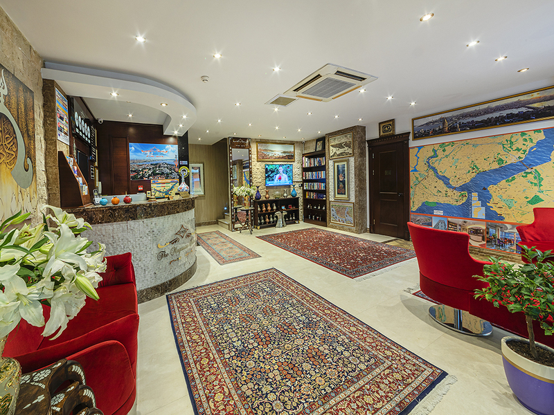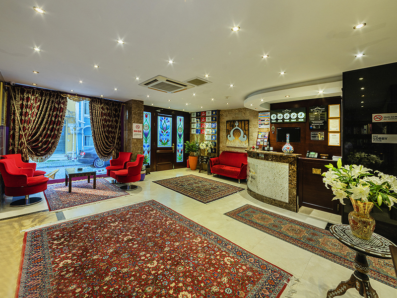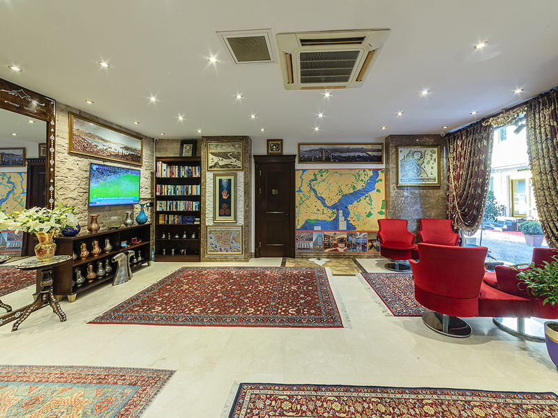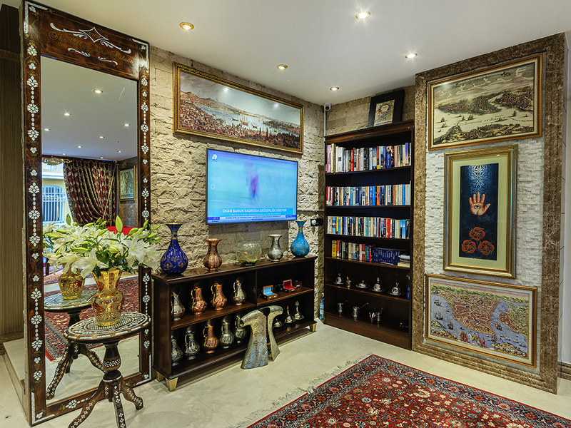 お安めのホテルでありながら、ロビーはとっても華やか!下にはトルコじゅうたんが敷かれ、壁にはボスポラス海峡を中心にした巨大な地図が飾られています。奥まった所にはトルコの伝統的な金属製の水差しがカラフルに置かれ、花瓶もお花に負けないくらい華やかなものが使用されています。まるでこの空間そのものがシルクロードを表しているかのようです。