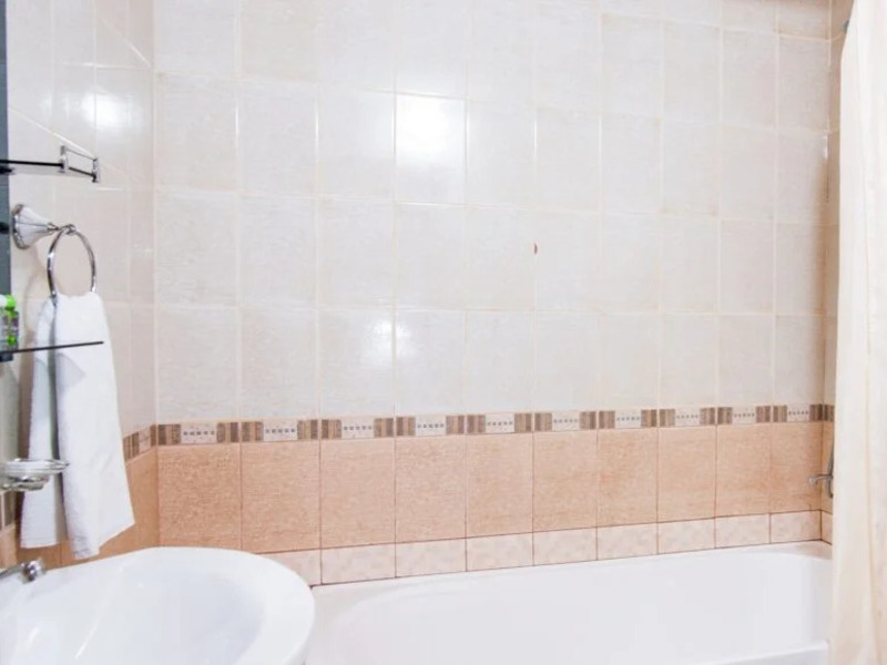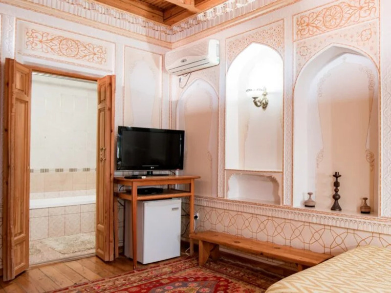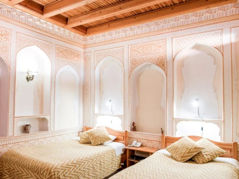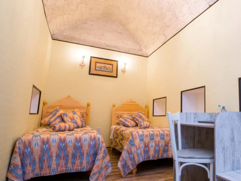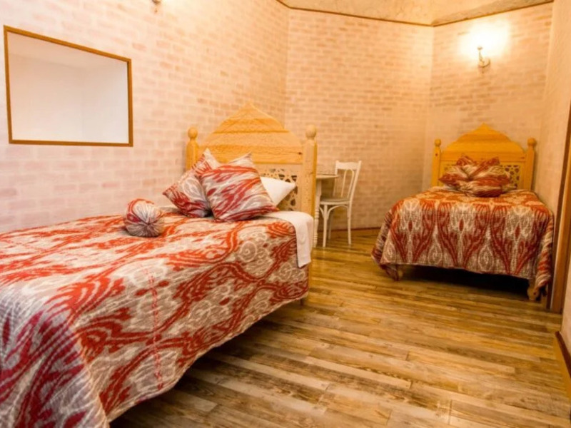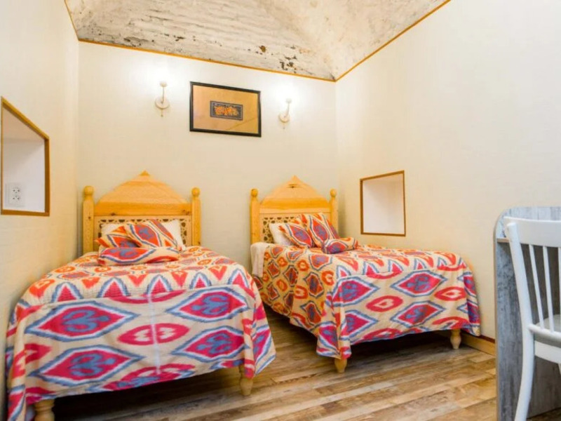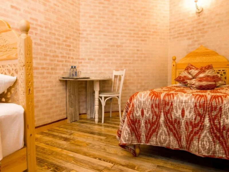 木の温もりを活かしたインテリアが印象的で、上質さと実用性を兼ね備えた落ち着いた空間が広がります。ドアや窓の木製の扉、フローリング、天井など、明るい色合いの木材が空間に開放感とやわらかな光をもたらします。天井の梁に施された繊細な木彫り装飾「ボルロル」も美しく、さりげないアクセントに。さらに、白を基調とした壁やアーチ、ニッチが軽やかで心地よい雰囲気を演出しています。大きめのベッドを2台備え、ベッドサイドテーブルやランプ、デスクとチェア、ワイドスクリーンテレビ、エアコンなど設備も充実。ベッドカバーやカーテンには、手織りのウズベキスタン伝統布「アドラス」が使用されています。床には大きなカーペットが敷かれ、よりくつろげる空間となっています。