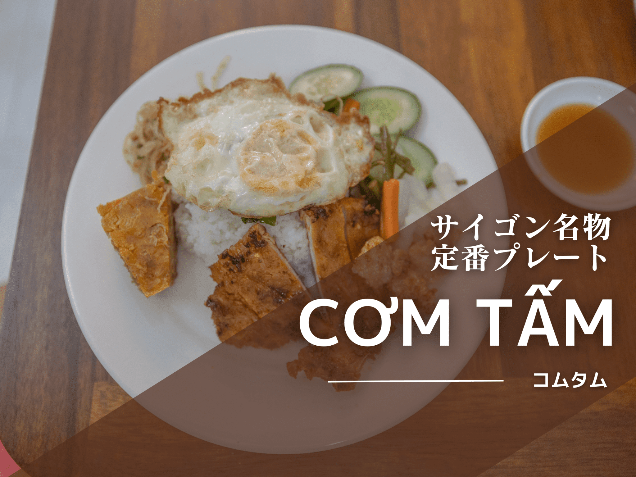 コムタムは南部発祥の定番プレート。一皿の上にお米、ポークリブを代表とした豚肉、卵、野菜、その他おかずをのせた満足の定食です。お米はもともとは精米の際に砕けたブロークンライスを利用し、庶民や学生などが安価で食べられる南部料理としての起源がありますが、今では全国的に万人に愛されるグルメです。それは、一皿でこんなにいろいろ乗っけて楽しめたら庶民に限らずみんな好きに決まってますね。ただ、ハノイより南部ホーチミンの方が圧倒的にお店や屋台の数が多いです。