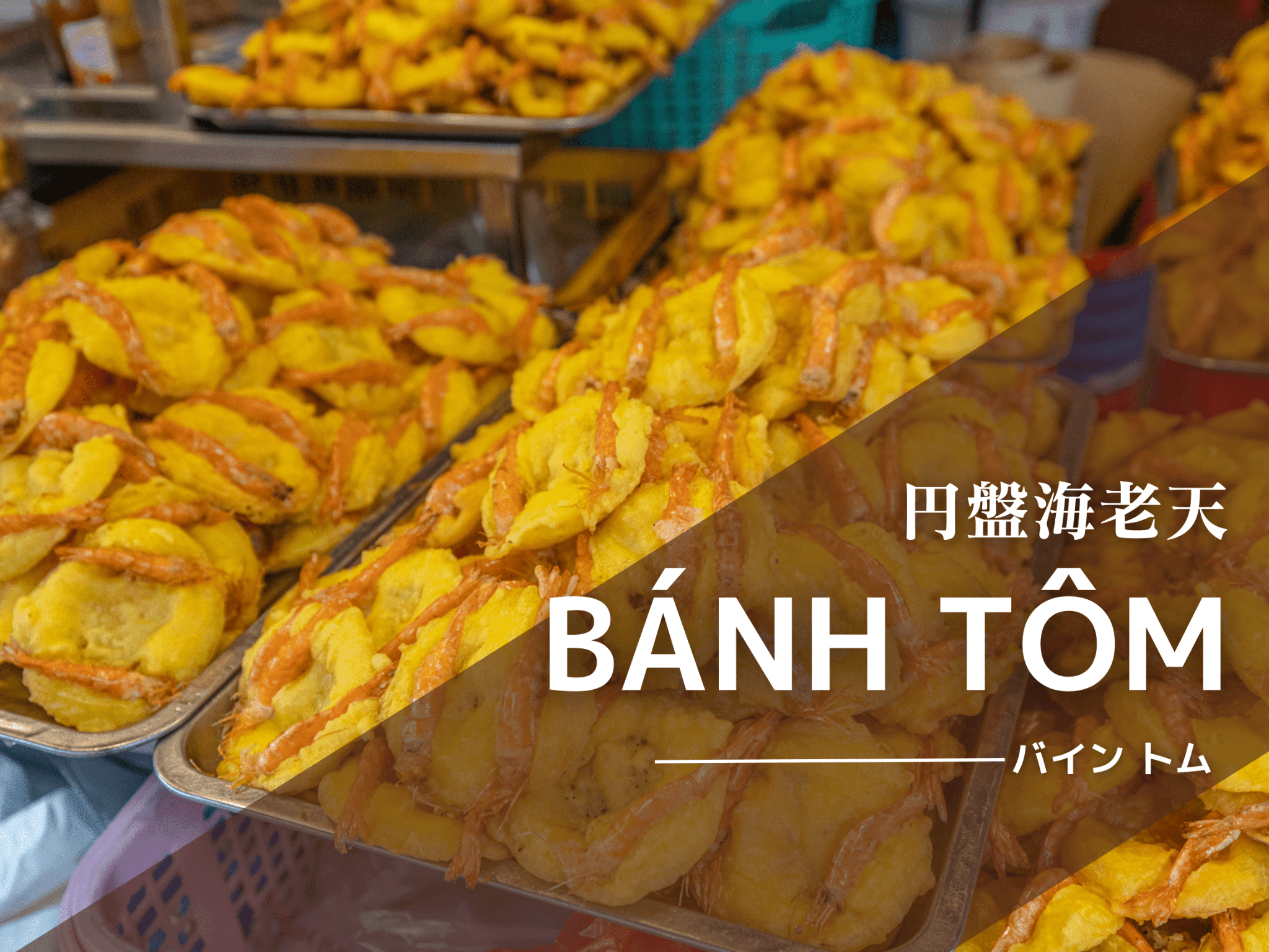 トムはベトナム語でエビの意味。まさに海老天そのものですが、円盤ケーキ風に上げられたお店が多く、食べ歩きとしてもレストランの一品としても楽しめるグルメです。ハノイでは一番大きな湖、西湖にある西湖府の参道で参道グルメとして売られているものが有名です。