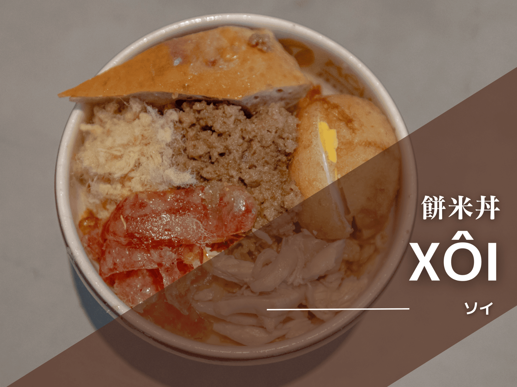 Xoiはもち米の意味で、どんぶりにもち米、って提供される丼ものです。よりローカルなものになると路上でバナナの葉を皿にしてもち米、肉、ドライミート、キュウリなどを入れて簡易的に包んだスタイルでベトナム人の朝ごはんの定番となっています。腹持ちもよくお肉でパワーも付くため、朝からエネルギー補給にはピッタリです。
