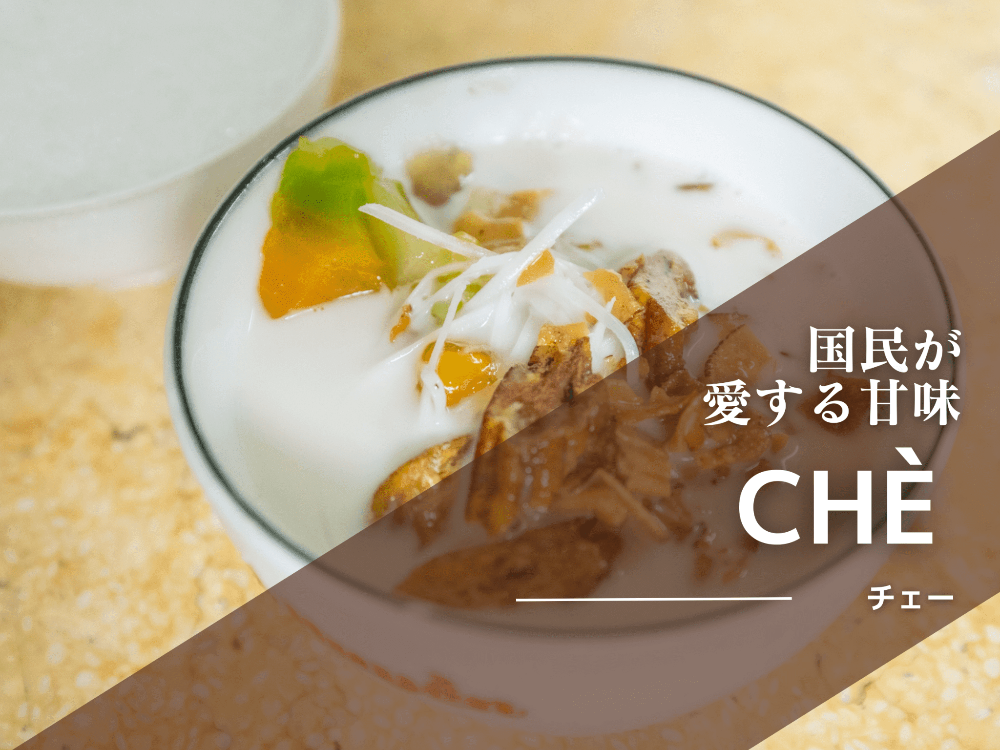 ベトナムデザートの代表格がチェーです。小豆や寒天、フルーツ缶詰などにかき氷を混ぜてココナッツミルクと合わせていただくものが一般的です。道端の屋台で見かけることも多く、メニューによってChe○○など名前が決まってきます。例えばベトナム人が愛する蓮の実のチェーはChe Sen、ミックスチェーはChe Thap Camなど様々なフレーバーがお楽しみいただけます。