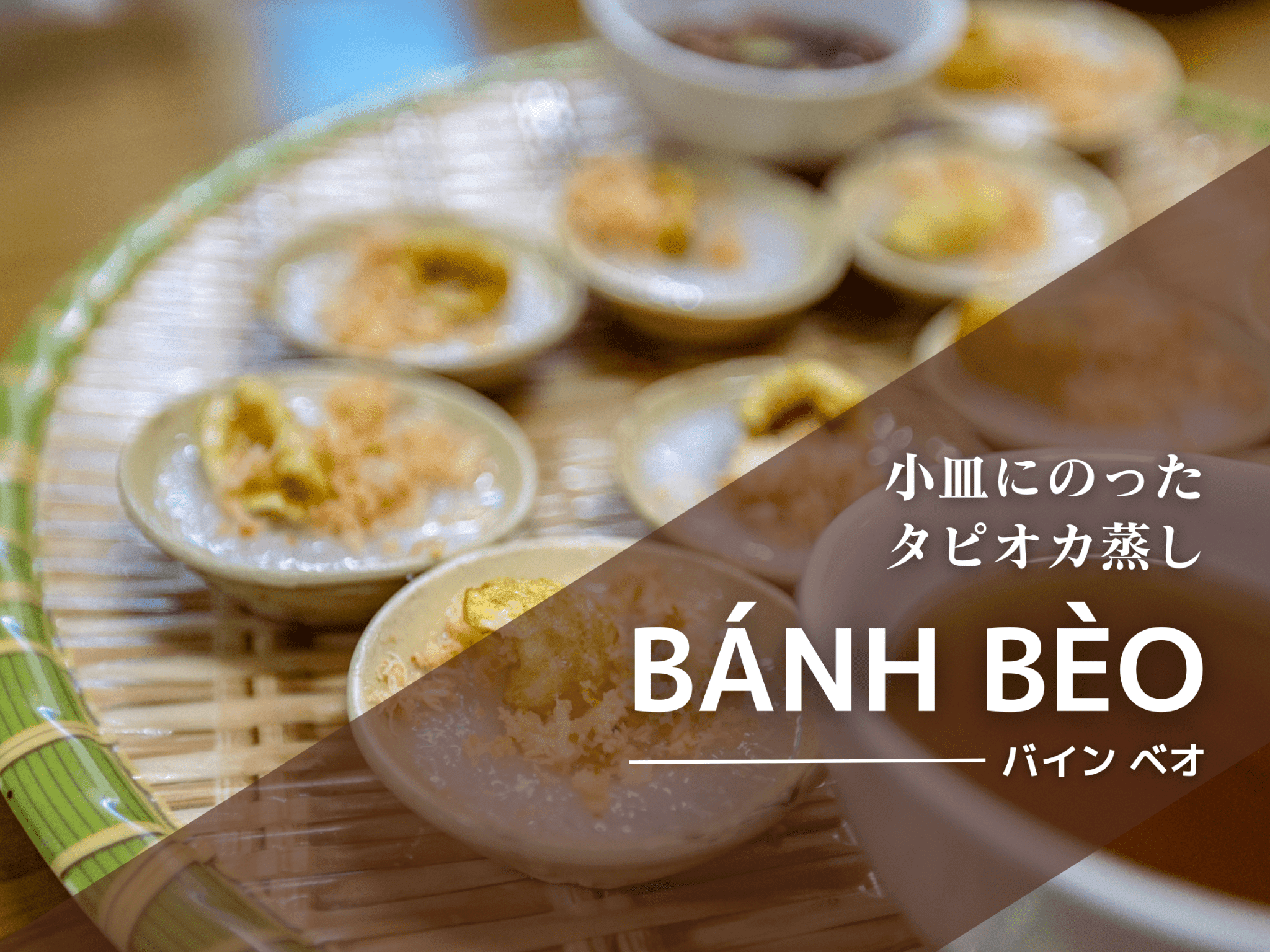 バインベオもフエ名物の宮廷料理期限のグルメ。米粉とタピオカ粉ベースの生地を小皿に蒸して、その上に干しエビや豚肉などをのせた上品なベトナムグルメとしてフエを中心に、全国でもレストランで見かけることがあります。