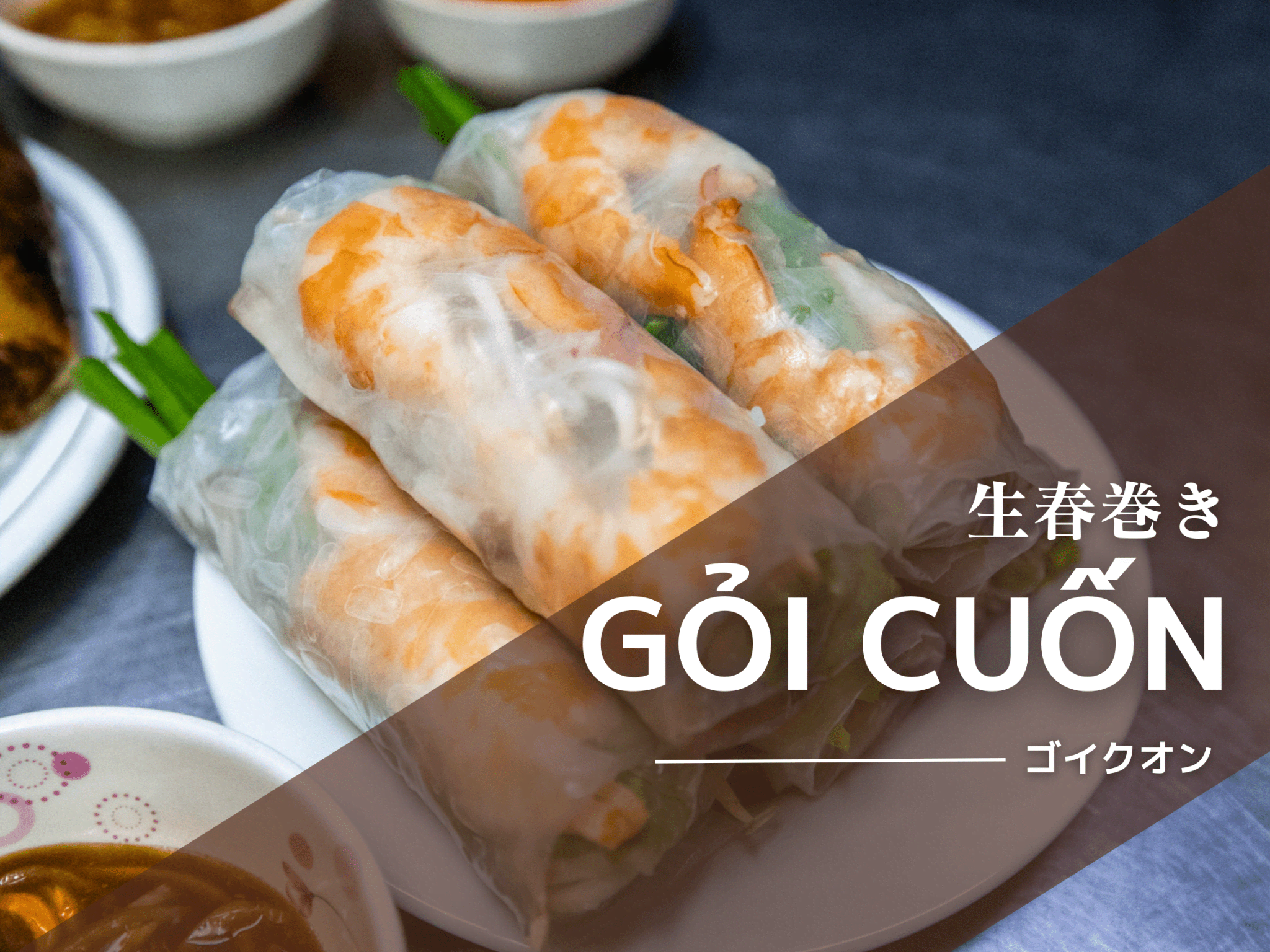 ゴイクオンは生春巻き。野菜とエビや豚肉をライスペーパーで丁寧に包んだベトナム料理の代表格ですが、ハノイでは屋台やマーケットで見かけることは少なく、ベトナム料理レストランでメニューに並んでいます。一方ホーチミンでは路上屋台やマーケットでストリートグルメとして見かけることもよくあります。素材そのものの味を楽しみながら、ピーナッツソースにつけて食べるのがベトナム風生春巻きの魅力です。