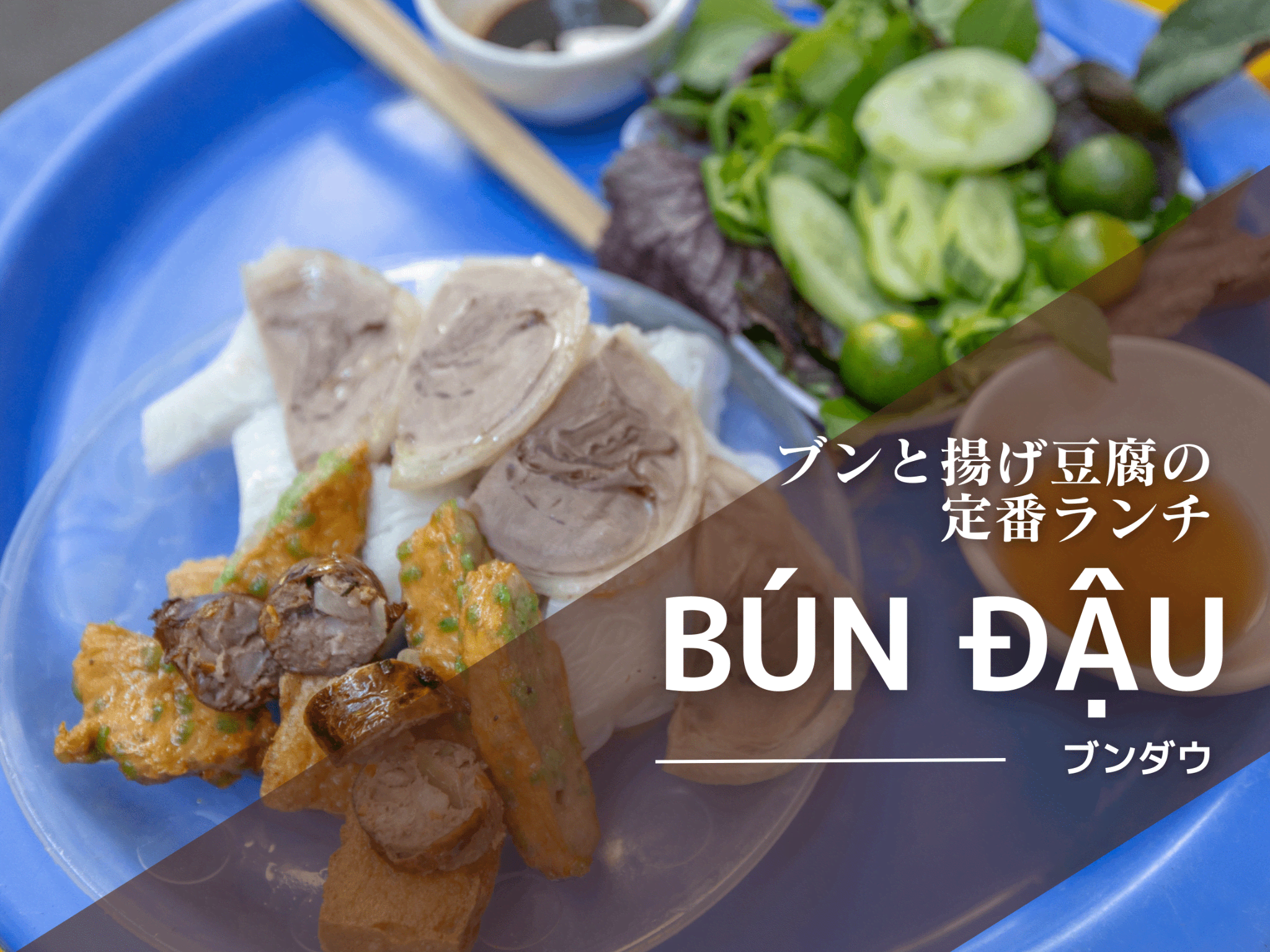 ブンダウはハノイのランチの定番。ブンと豆腐、お肉やチャーシューと野菜がお盆に乗って出てくるハノイグルメです。ブンと豆腐のコンビネーションなので、もともとは貧しい地域の昼食に期限を発しますが、今ではハノイで地元民から最も愛されるランチの一つとなっています。ブンは麺ですが、ブンダウはスープでほぐす前の絡まった段階で皿に盛って提供されるため、ほのかな酸味のあるブンそのものの味を一番楽しめるグルメといえます。ブンダウはヌクマムのほかにエビを発酵させたマムトムをつけて食べるのが伝統スタイルですが、ナンプラーや魚醤が苦手な方にはどの店にも醤油の用意があるのが一般的なので、醤油で出すように注文すれば苦手な人もお楽しみいただけます。