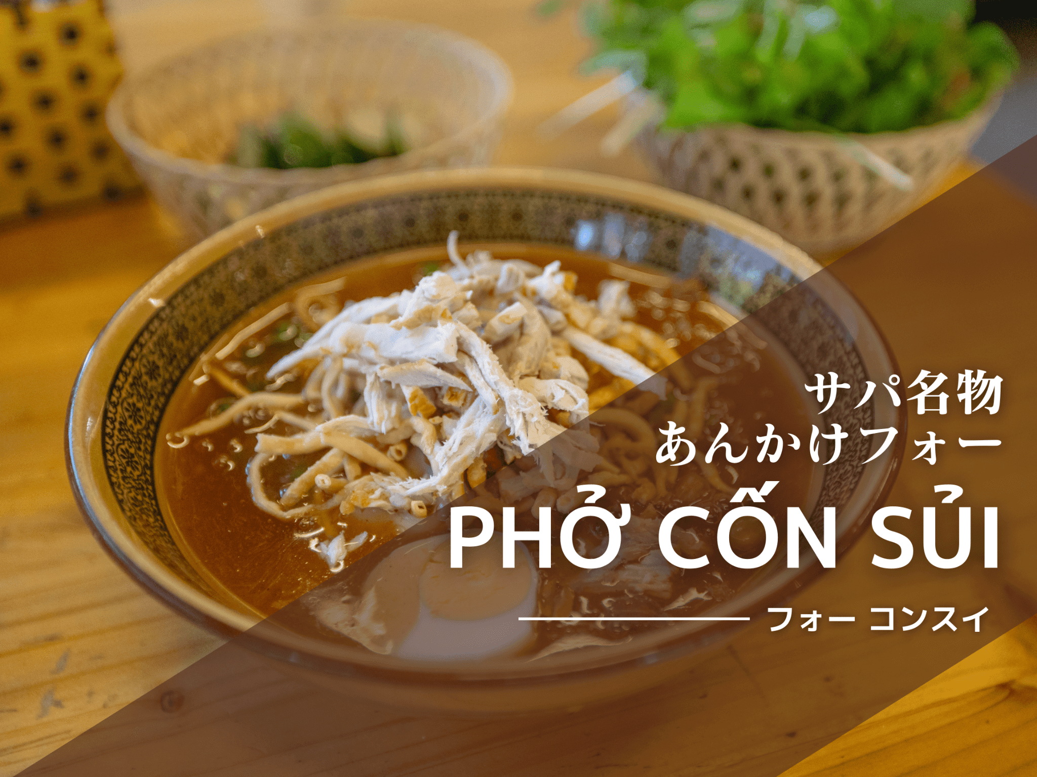 北部山岳地帯、棚田で有名なサパの名物フォー。フォーはフォーでも汁物というよりはあんかけフォーです。麺ももちもちで太く、鶏ベースのあんと香草やナッツをかけて食べるフォーは、サパに旅行の際は絶対に逃せません。