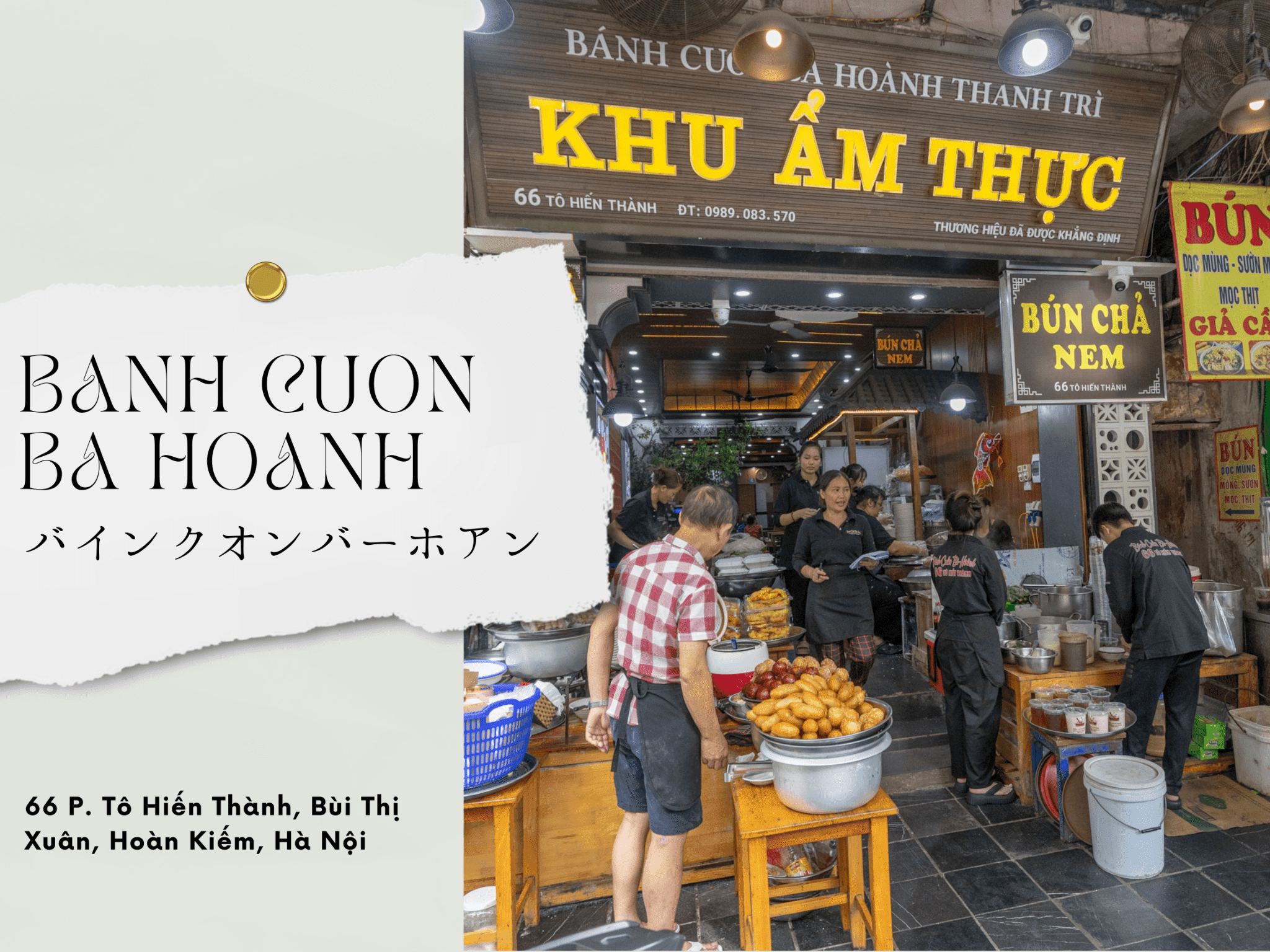 ハノイ旧市街南部のバインクオンの名店。個々のバインクオンはハノイトップクラスで美味しいうえに、バインゾーや揚げ春巻き、バインボット、デザートのチェーなどベトナムグルメのサイドメニューもクオリティ高く充実しているため、一度の食事で様々お楽しみいただけます。