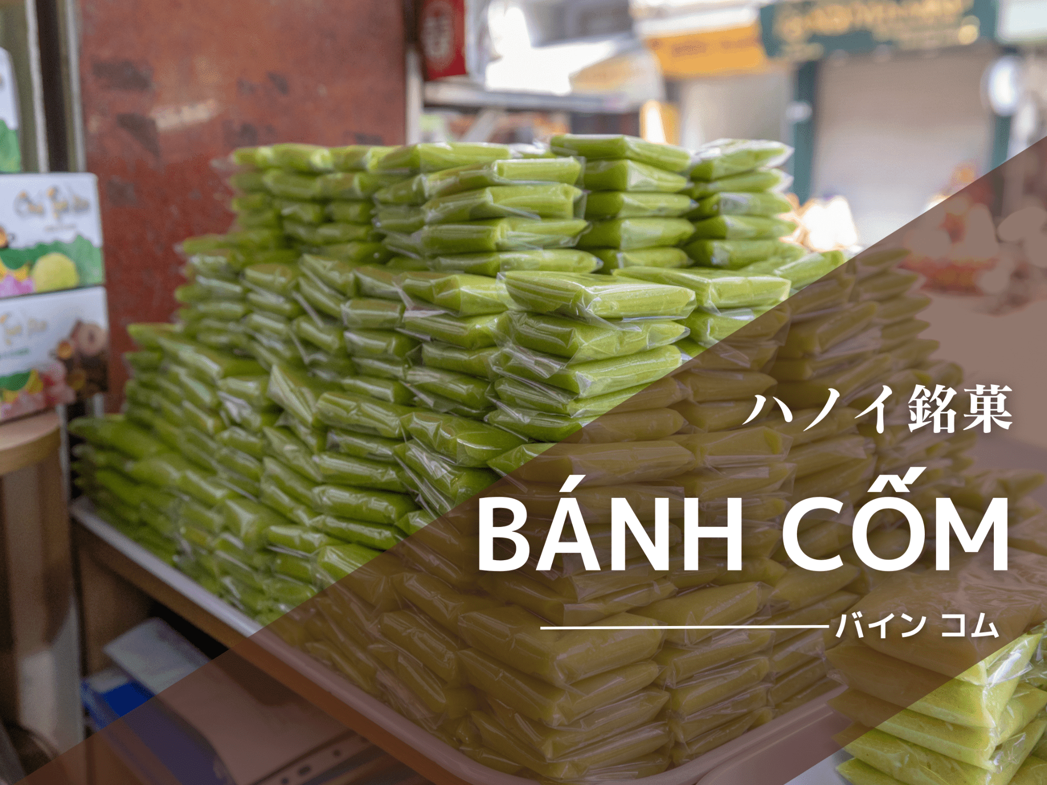 バインコムはハノイ銘菓。京都と言ったら八つ橋、広島と言ったら紅葉饅頭のようにハノイと言ったらバインコム。ハノイの人が他都市にお土産を持っていく場合は重たいですが定番となっています。緑豆を使ったお餅の中に、同じく豆の餡とココナッツが入ったほんのり甘いベトナム風和菓子は独特ながらやみつきになります。