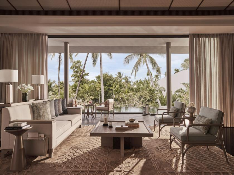 キングベッド1台とシングルベッド2台。リゾートのラグーンを望む広々としたヴィラ。プライベートインフィニティプール、オープンプランのリビング・ダイニング、設備完備のキッチン、家具付きテラスとラウンジチェアを備え、潮風と緑に囲まれた開放的な空間でゆったりとくつろげます。各ベッドルームはダブルシンク、レインシャワー、深めのバスタブを備えたオアシスバスルームと直結。コーヒーメーカーや無料のリフレッシュメントギャラリーも揃い、快適に過ごせます。