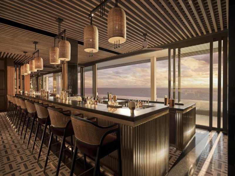 リージェント・フーコックの屋上に位置するスカイプールテラス&バーで、ジンを中心としたカクテルが特徴です。スタイリッシュな空間からは、遮るもののない海の景色と沈みゆく夕日を眺めながら、洗練されたドリンクを堪能できます。昼は爽やかな海風を感じながら、夜はロマンチックな雰囲気の中で特別なひとときを過ごせます。