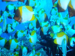写真(右):トビエイの他にも、カスミチョウチョウウオの群れなどもいました!!こんだけいると…結構気持ち悪いかも。。笑