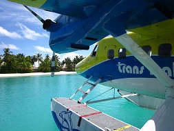 写真左)ラスドゥ環礁にあるクラマティへは水上飛行機で約20分♪