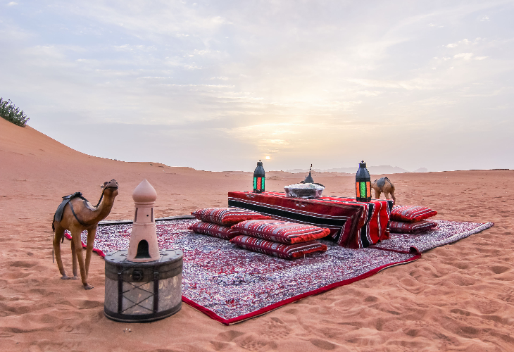 砂漠キャンプでは、ラクダ乗りやアラビックコーヒー&デーツでほっとひと息。