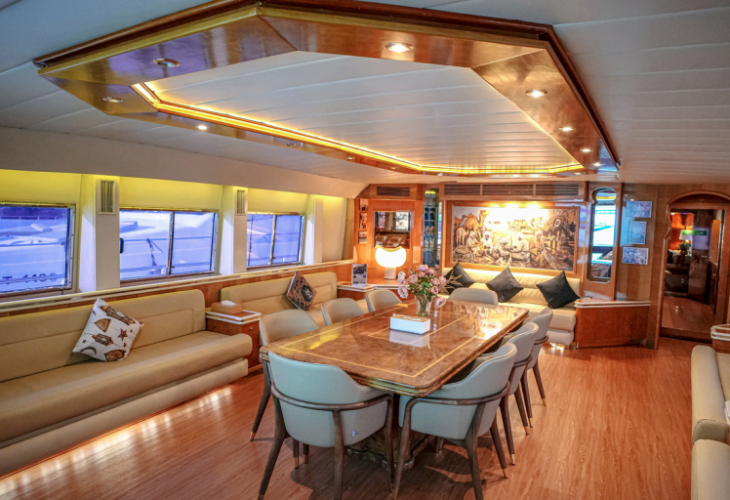 人気DJによるライブ演奏、無制限のドリンク(オプション)、有名ホテルブランド監修の5つ星ディナーを楽しみながら、煌めくドバイのスカイラインの下をクルーズ。