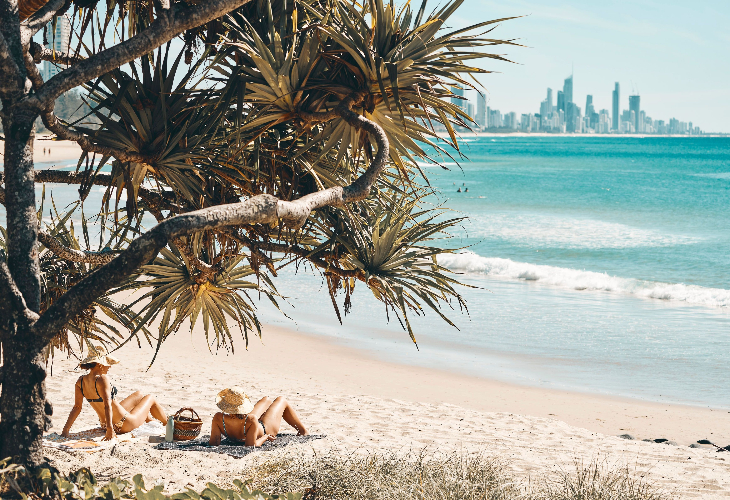 海の向こうに見えるサーファーズパラダイスの街が背景にみえる絶景ポイント、人気のバーレーヘッズで自由時間をお楽しみください。