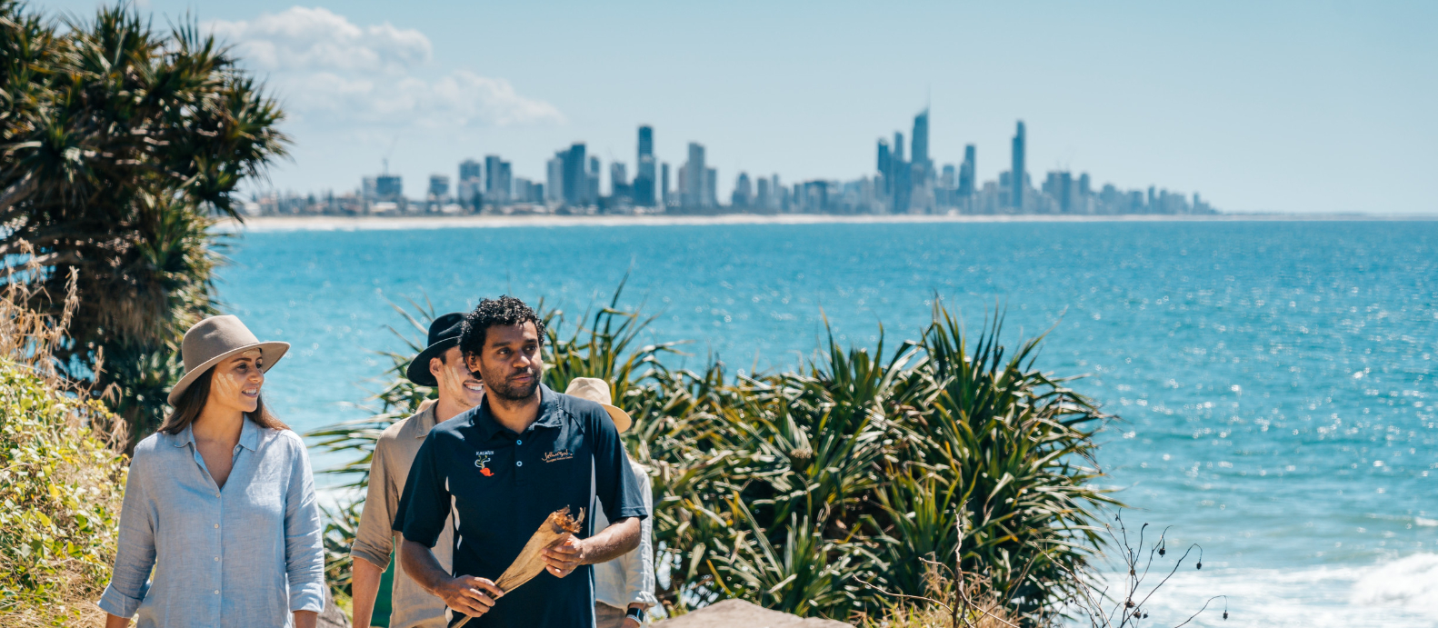 ローカルに愛されるバーレーヘッズで、先住民の聖地の海岸沿い(1.2km)をガイドと散策。語り継がれる創造の物語「ドリームタイム」や、自然の食材「ブッシュタッカー」の知恵に触れながら、サーファーと高層ビル群が織りなす絶景パノラマを満喫。