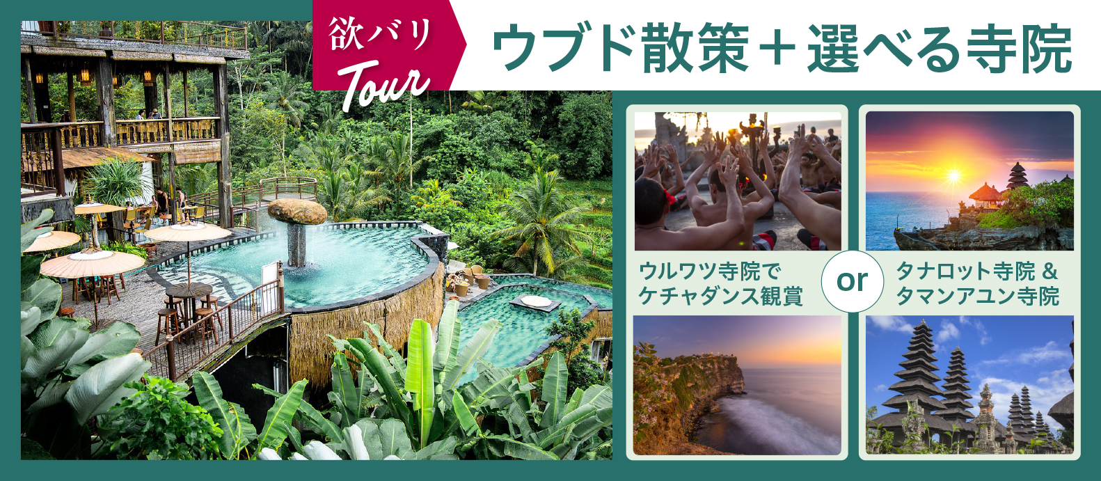 【欲ばりツアー①+②】ウブド散策ランチ付きとウルワツ寺院でケチャダンス観賞(夕食付き)