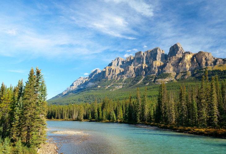 キャッスル・マウンテンは、カナディアン・ロッキーの壮大な山で、名前の通り城のような形をしています。標高は3,246メートルで、山頂からは360度の絶景が広がり、周囲の氷河や湖が美しく映えます。登山者にとっては挑戦的な山ですが、眺望の素晴らしさは格別です。特に晴れた日には、ロッキー山脈の壮大な景色を存分に楽しめます。