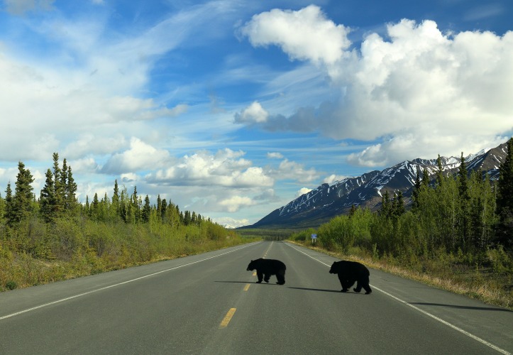 途中、車窓からは、クマやムースや鷲などの野生動物を高確率で見ることができます。前方には山々の絶景が広がるドライブロード!