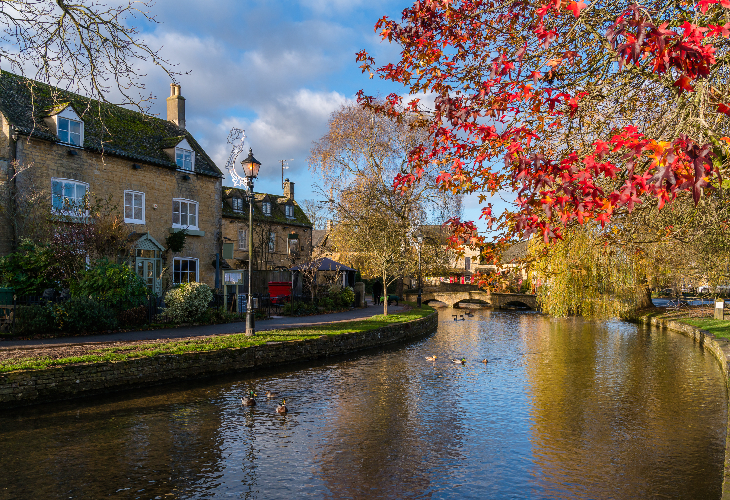 ボートン・オン・ザ・ウォーターは、小川が村を横切ることから「コッツウォルズのヴェニス」と呼ばれる人気の村。低い石橋と水辺の遊歩道が絵本のような風景をつくり、のんびりと散策を楽しめます。