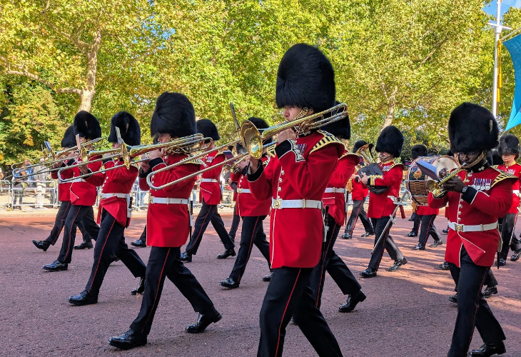 (注意:衛兵交代パレードは雨天中止。基本的に月、水、金、日曜日が実地日となっておりますが、実地されない日や、公式行事で中止になることもございます。衛兵交代の無い日はバッキンガム宮殿公式ショップ又は騎馬兵交代式にご案内いたします)