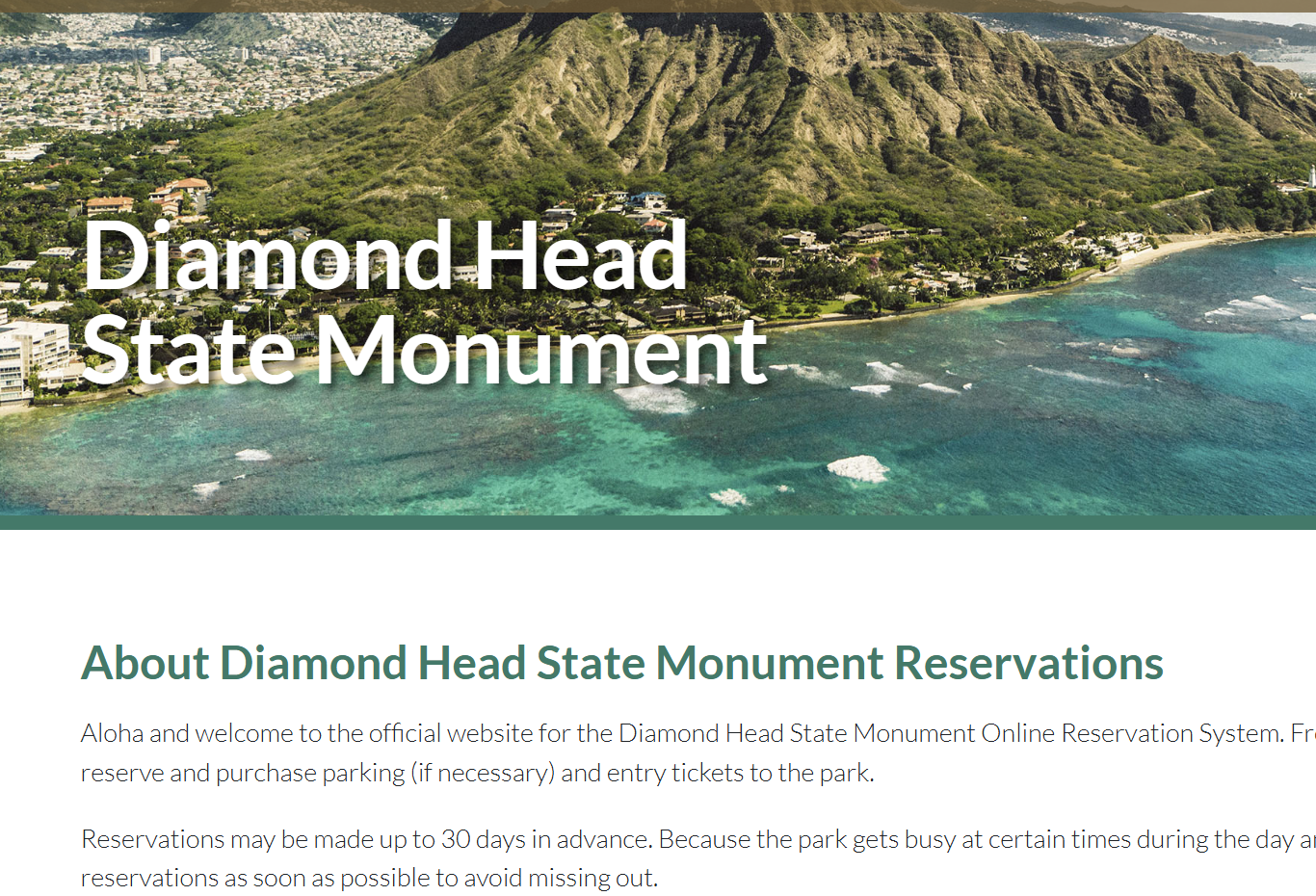 ●ダイヤモンドヘッド入園事前予約サイトにてご自身でご予約ください。(※予約のし忘れでの、キャンセル・変更はできかねますので、必ず片道シャトルの申し込み前に事前予約をお願い致します。https://gostateparks.hawaii.gov/diamondhead)