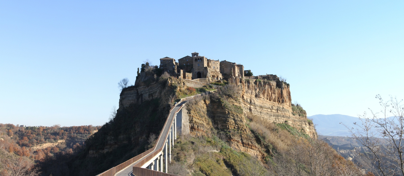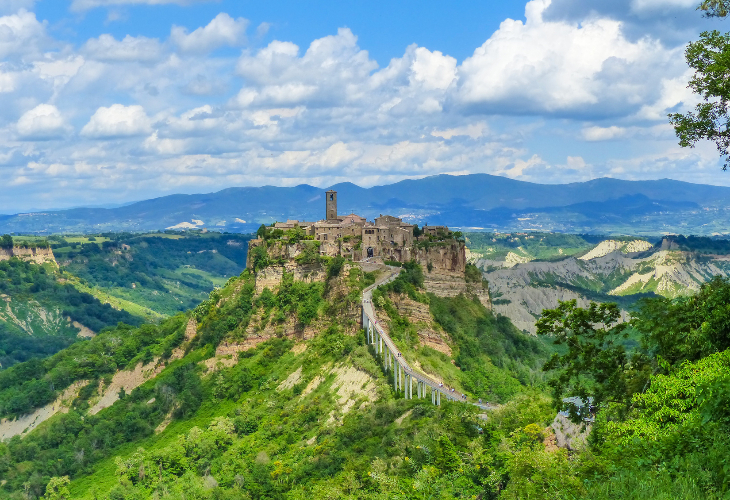 「滅びゆく町」の異名を持つチヴィタは、断崖絶壁の上にありながらも外からの険しさとは違い、明るい美しさを保った訪れる人を魅了する町です。