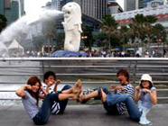 6人揃うとそうとう怪しい。 今回初参加はヒッチ、最初の任務はトランジットの地シンガポールでマーライオンへ行っちゃう!