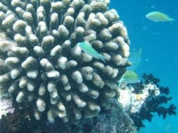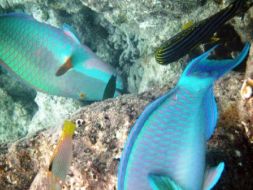 深みの上に広がる濃密な青い世界にアカモンガラの青黒い影のような姿が無数に、と思っているうちに私のまわり一面を取り囲んでいました。群れを抜けると水族館の大水槽の中にいるような錯覚を覚えました。真下に広がる世界には、パウダーブルーサージョンフィッシュのほか、アデヤッコにニシキヤッコ、イエローヘッドバタフライフィッシュ、チョウチョウウオ、スズメダイ類が…シュノーケルを付けたまま「 ううっ!! 凄いっ!! おーう!!」と騒いでしまいました。(* 「アカモンガラ」は、アカ歯モンガラ、が詰まってアカモンガラと言われるようになったと考えられている魚で、にっと口を開けると赤い歯が覗きます )水の流れが速いと聞いていたので少し緊張しながらEXIT5へ向かいました。確かに少し早い流れだったので、今進んでいた方向とは逆に島を左周りに進んだ方が楽だということがわかりました。たくさんの魚がいるのでどこを見てよいかわからず右往左往してしまいます。ヘラヤガラや鯛の類いがペアで泳いでいるのは微笑ましいし、パウダーブルーサージョンフィッシュが2匹でお互いの尻尾を追いかけてくるくると回る輪舞にも見とれてしまいました( 実際はえさの藻の取り合いかもしれませんけど )
