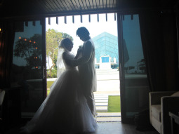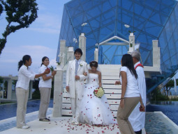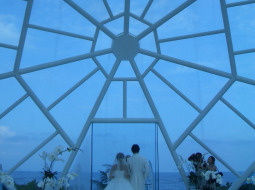 2008年にオープンしたばかりで海辺に広がるグリーンの敷地にまばゆく輝くその外観は、ことのほかゴージャスな印象。昼間の青空の下のセレモニーもお勧めですが、夕方のライトアップされたチャペルもまた幻想的で素敵な魅力ですよ!