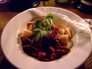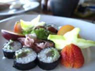 部屋に戻ったら、一気に疲れが出てきた。 ほとんど何にもしていない一日なのに、疲れている。かなりゆっくりとバスタイムを楽しんで サンデッキでコーヒーを飲みながらくつろいでいるとお腹が空いてきた。 そう言えば、お昼はほとんど食べていない。 テーブルには、補充されている果物があった りんごだけかじってみた。 それが、空腹へ加速度をまし お腹の中はただ事じゃないくらい鳴っていた。 しかし、また、レストランまで行く道のりを考えると面倒にもなる。が、飢え死にはもっとやだ!! と言うことで、重い体を引きずってレストランへ向かう。今日は、遠くのレストランまでやってきた。 やっと晩飯だ!! ディナーも基本的にアラカルトなので 自分で好きなものを頼む!!まずは、前菜…とか思ったりもするのだが面倒なので サラダとパスタと天ぷらの海苔巻き見たいのを頼んで、分けることにしたのだが… そうそう、スープが自動的に出てきたっけ!! サラダは、2人前って感じの量だ。地元のハーブを使ったサラダを頼んだ。パスタは、地元の魚を使ったトマト味のパスタ。 量は、1人前だったのでもう一皿頼む。