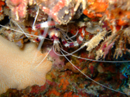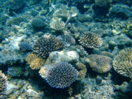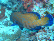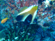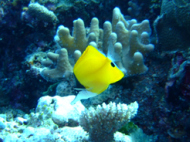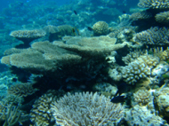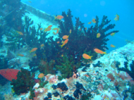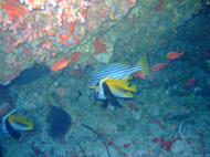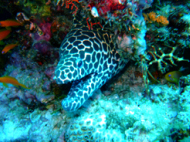 お客さんは、5,6人である。 他のお客さんは、あまりリクエストをしないと言うより私たちについてくれた日本人ガイドさんが ベースリーダーがいない今は、取り仕切っている。 ので、この人さえ味方に付けちゃえば我侭が意外と通ることになる。ここはエキゾチカからは40分くらいだといわれた。 ポイントに向かう途中も色々とお話をしてくれて 私たちを飽きさせないように気を使ってくれる。ポイントに着いたが全然、波がない… 流れがある時に根にぶつかる海水が独特な水面を作る??これが無いと流れは期待できない… ガイドさんが潮を見に行くと言って潜っていった。 流れはちょっとしかありませんよぉ~!!って、言ってる。はぁ~残念!! エントリーしてすぐに潜降!! 見たいのを期待してたのですが… エントリーして、3人揃ったらゆっくり潜降していく。流れは、ないものの透明度はかなり良い!! 今回は、透明度のわるいところは無しである。適当にサンゴがあって、適当に魚が泳いでる。 本来なら、流れを読んでみたいなダイビングだがすっかり、癒し系ダイビングになっている。道理で眠くなるわけだぁ~!! ここでは、ウツボがかなりいた。 普段見かけないようなウツボ達だ!! しかも、ウツボ君は休憩しているところを邪魔されて ガイドさんの足をかんでいた…大丈夫??その他には、小さいナポレオンとかヨスジフエダイの群 良くわからないカニとかオトヒメエビとか小さい甲殻類もわりと沢山いた。