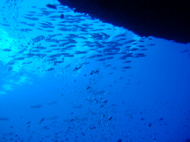 後は、水深27,8m.くらいのところから見上げた時に 小さいアジのご一行様が大きいアジ?カツオ?が 朝食として小さいアジを狙っていた。透明度が良いので水深をあまり感じない… 深くまで潜っても明るいのですよねぇ。サメも遠くにチラッと見たり、ナポレオンも見たりと 40分くらいでダイビング終了!!