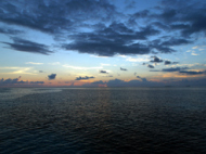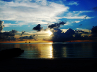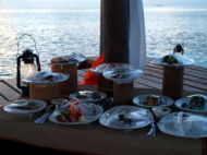 が、私たちは、レイトチェックアウトを チェックインの時に申し込んでいた。前回は、レイトチェックアウトを申し込まずに ジプシーになった挙句日焼けで真っ黒になった記憶があるので… とりあえず、時間は決まっていないが部屋を 移動して欲しいとの事だ。レイトチェックアウトは確約すると言っていた。 違うパターンでジプシーだ!!桟橋では、ダイビングセンターにまだ残っていた。日本人スタッフに見送られながら 沖合い5分も掛からない シュノーケリングパビリオンに向かう。スタッフたちは、手ぶらなので 料理とかどうするんだろうと思っていたのだが… シュノーケリングパビリオンには 既に色々とセッティングされている。 ちなみに料理も既に出来上がって 隅っこの方にまとめておいてある。 とりあえず、好きな時間に好きな格好?体勢?で 2人だけでディナーをどうぞと言うことだ。日本人スタッフに写真を撮ってもらい 簡単な説明を受ける。 ここで料理の説明もされるが… なぜか日本人スタッフがいるのに英語である。食に関する英語は理解できない私達であるのに… 最後に携帯電話を渡されて 飲み物の注文や食事が終わったら 電話をくださいと言われる。ここで、初めてワインを忘れたことに気が付く… 何のために、我慢していたかわからない。まさか、取りに行けとも言えないし…諦めた。飲みのもは、バーのメニューを持ってきていないので 取りに言ってくると言い残してスタッフは引き上げていった。ミネラルウォーターは、大瓶で2本用意されている。 しかも、樽に氷を入れて冷やしてあるので コップに注いだ後に元に戻し忘れない限り 冷たい水が飲めるのだ。ここから自由な時間である。 ここは、椅子があるわけではなく ローソファー(マットレスの豪華板みたいなやつ)が2人分引いてある。ここで、寝転びながら食事を楽しむのもありと言っていた。 テーブルもソファーに合わした高さのものが置いてある。なので、まともに座って食べると結構食べにくい。 私たちは、夕日の方に向いてパビリオンの縁に座り 夕日が沈むまで見ていた。かなりロマンチックだ…しかし、雲が出ているので 水平線に沈むところは見れなかった。日が沈んでもしばらく、夫婦の会話を 楽しんでいるとメニューを持って スタッフがボートでやってた。 わざわざすまないねぇ~!! と言ったら、問題ないよ!!と言っていた。しかし、メニューを置いて帰ろうとするので すばやく、飲み物をチョイスする。ここで、このスタッフたちを逃すと 飲みのもはいつ来るかわからない…料理の量は、かなり多いので 飲み物が来てから食事をしようということで しばらく、海を眺めていた。 近くに、ニューカレドニアから来て ヨットで世界を回っている人たちの ヨットが賑やかだった。この人たちとは、ダイビングで一緒になって 話もしているので、なんとなく親近感がある。