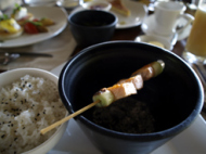 本日は、ダイビングも出来ないので のんびりすることにしていた。 が、そう言えば引越しがあるんだっけ!!あれ、奥さんはアユルヴェーダ行くんだっけ!! そう言えば、シュノーケリングもしてないなぁ~!!と言うことで、何処まで のんびり出来るか疑問がわくところだ。 あっ、ダイビングセンターに新しく引っ越す部屋に 機材を送ってもらわないと!!朝食の帰りにダイビングセンターによって 部屋番号を伝えれば良いか… 今日は、のんびりと朝食に向かう。相変わらず、炎天下の下を写真撮りながら… そして、汗だくになるのも変わらず… レストランに着くと既に決まった席に案内される。 朝食も滞在も今日で終了なので 変わったものでも食べようかと考えたが あまり、思いつかず「鮭の照り焼き」というものを 頼んでみることにした。日本ではなかなか食べれない一品である。 しかも、炭火で焼いてあるらしい… テリヤキなのに炭火って…十分怪しい。待つこと5分くらい、待ってました照り焼き!! が、照り焼きではなく完全な塩焼き!! しかも、ここはリゾート それなりにお洒落に出てくるんですが さすがにお洒落にも限度があったのか イメージ的には、焼き鳥のねぎまの鶏肉が 鮭に変わっているだけである。