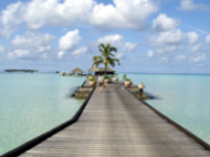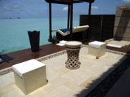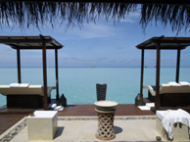 大急ぎで、レセプションによりカートを頼む!! そして、17時45分くらいに迎えに来るようにお願いもしておいた。 ディナーに行くのに汗だくは、ちとムードない…部屋に入ると、電話が光ってる。 一瞬、嫌な予感…会社か?? が、違った、旅行会社の方からの電話であった。奥さんは、部屋に入るなりバスタイム!!私は、旅行会社の人へ電話をした。 空港では、要領よく物事が進みすぎて ゆっくりお話をすることが出来なかったので 先ずは、お祝いの御礼をして快適なリゾートライフの報告をした。 奥さんにもお礼を言ってもらいたかったので奥さんに代わろうとしたが 鼻歌交じりのバスタイムじゃそうはいかない…ディナーから帰ってきたら電話することを伝え とりあえず電話を切らさせてもらった。私は、何も用意をしていない…シャワーを浴びて、涼んだら服に着替えた。 奥さんは、念入りに化粧をして鏡の前で洋服のチェックやら持って行く物のチェックをしている。バスタイムしていて電話に出れなかった件を えらく気にしていた。 私は、内緒で買っておいたプレゼントを どこに隠そうか四苦八苦していた。 やっぱり、ズボンのポケットか…ここはモルディブ!!時間通りにカートが来るわけがなく… 10分くらいオーバーしてやっと来た。ちなみに、水上コテージの桟橋は サンデッキから見ようと思えば見れる。 なので、カートが来るまではサンデッキでゆっくりしてた。