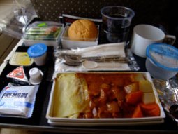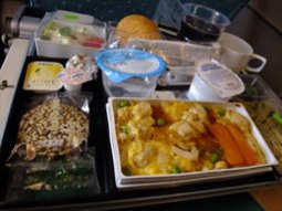 写真中:機内食(洋食)いまいちな感じ。