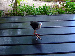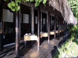 門を開けると、南国っぽい花が目に入るが… 奥は普通にレストラン、外人さんの食事中でした。