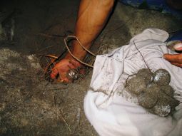 ところが、感動に浸っている間もなくリーダーが産み終えたと同時に嫌がるカメをどかし卵を集め始めました。