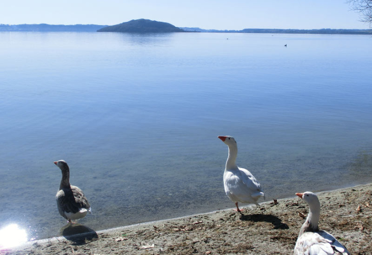ロトルア湖畔では、静かな水辺と温泉の湯けむりが織りなす絶景を楽しめます。