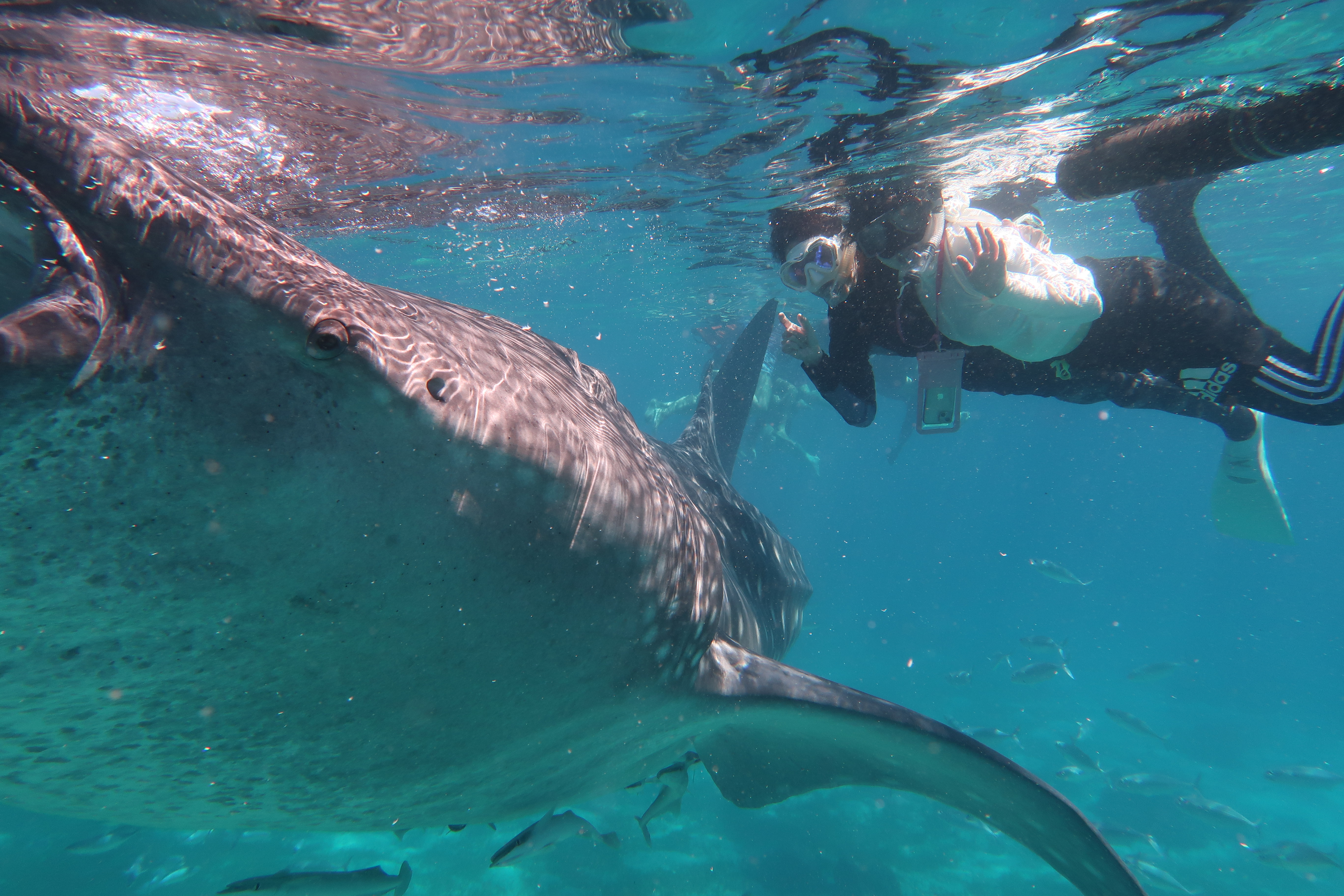2; スノーケルにはフィンの貸し出しも含まれます。ジンベイザメと一緒に海中を自由自在に泳いでください♪