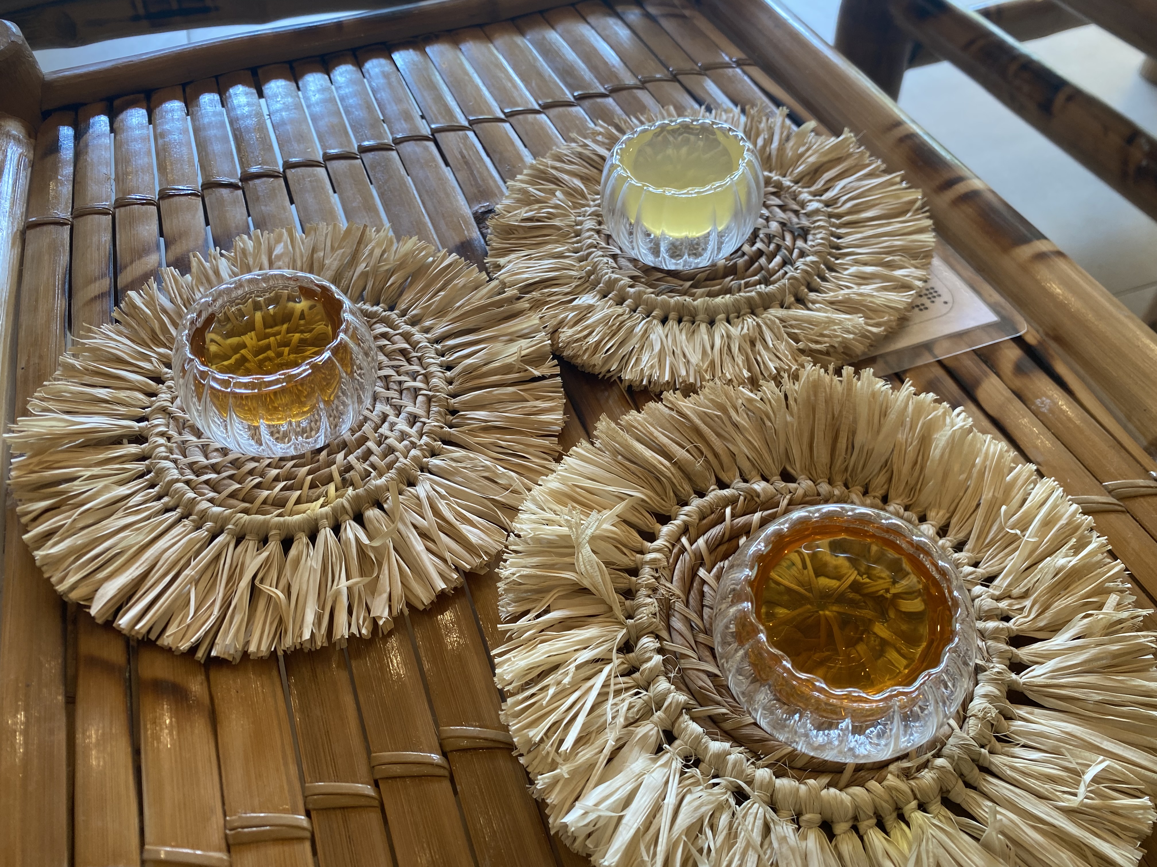 水面に香り豊かなレモングラスやグアバのハーブ、色鮮やかな花びらを浮かべた大釜を、乾燥した竹で火で起こし熱してできた