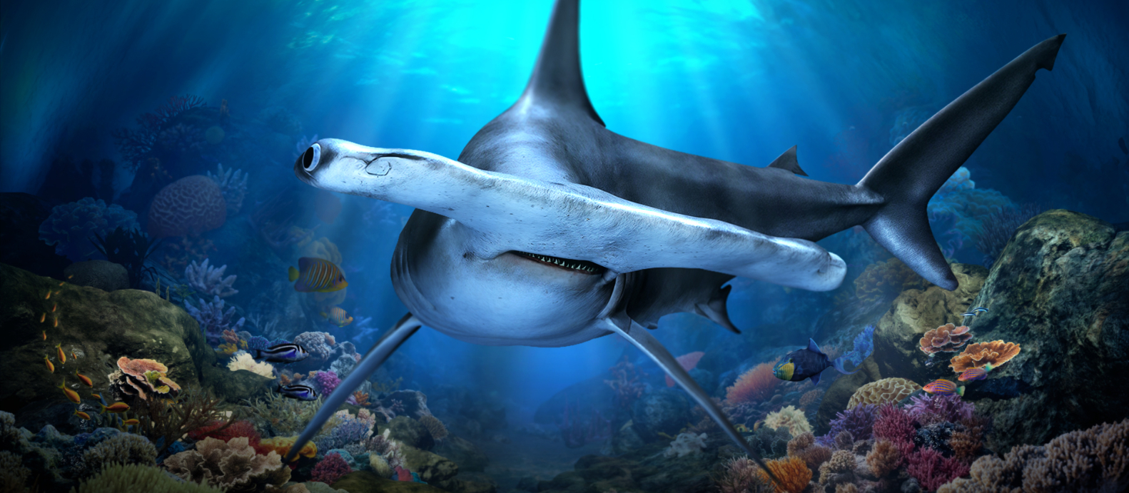 マンタやゼブラシャークが優雅に泳ぐ姿を間近で鑑賞できる、圧巻のメインビューイングエリア。まるで海中にいるかのような没入感を味わえます。