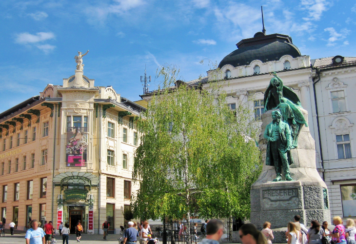 中世の街並みが残る歴史的エリアを効率よく徒歩観光し、プレシェーレン広場、三本橋、リュブリャナ城、ドラゴン橋などの名所を巡ります。